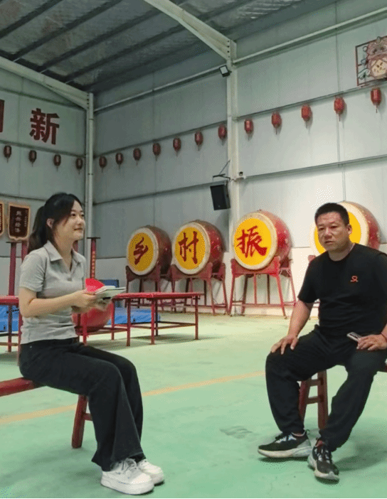 锣鼓声起,彩狮腾跃。2025年7月22日,洛阳师范学院开阳书院一号学生社区“豫见非遗・传承有戏”暑期社会实践队成员——2024级音乐学专业张笑语、段然同学,走进荥阳市王村镇蒋头村。在这里,郑州市级非物质文化遗产蒋头舞狮的第5代传承人李战老师,用一双布满老茧的手比划着狮头摆动的弧度,将这项延续七百年的技艺故事娓娓道来。