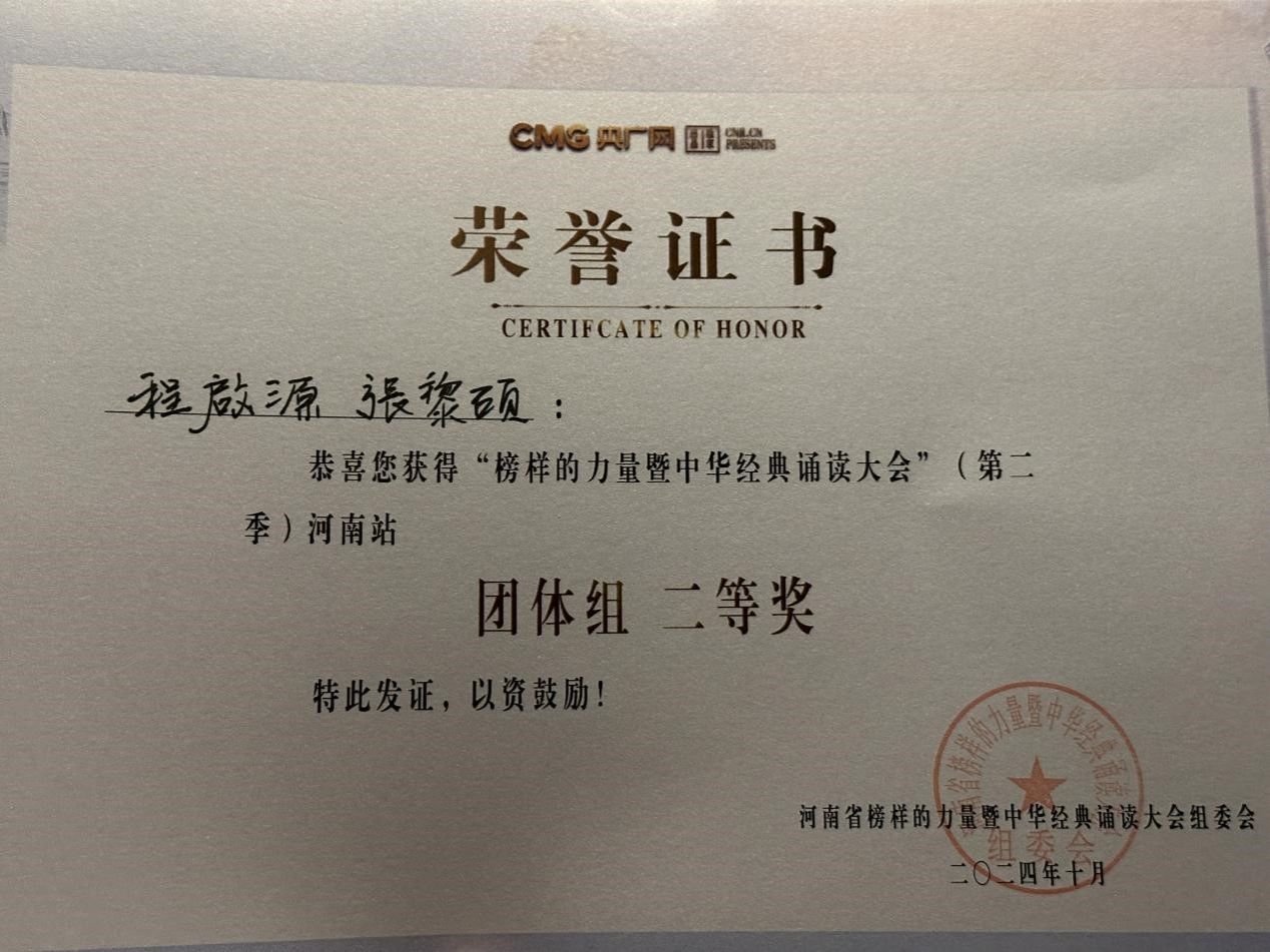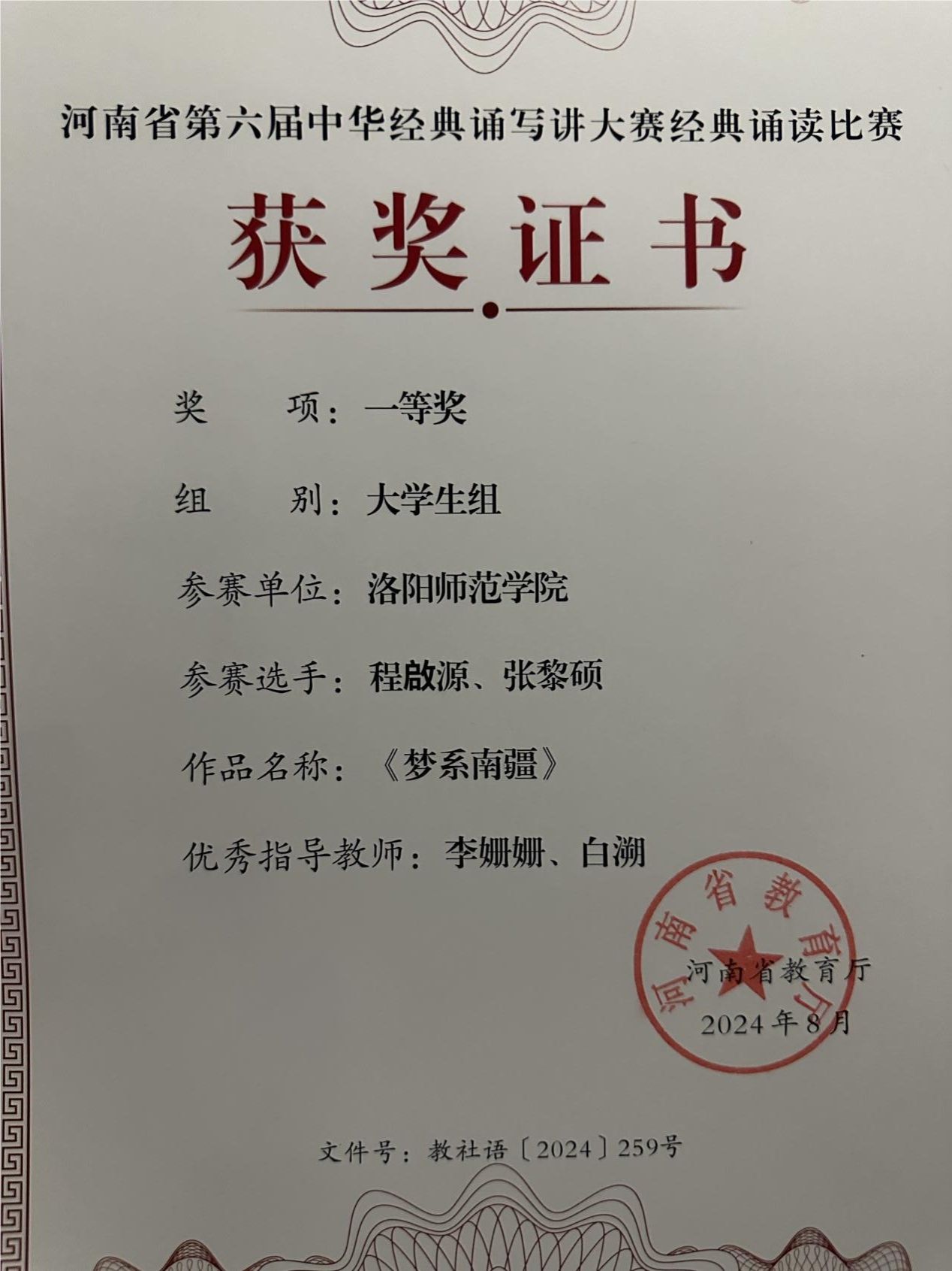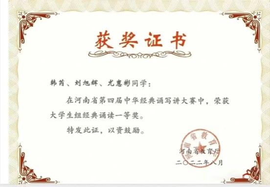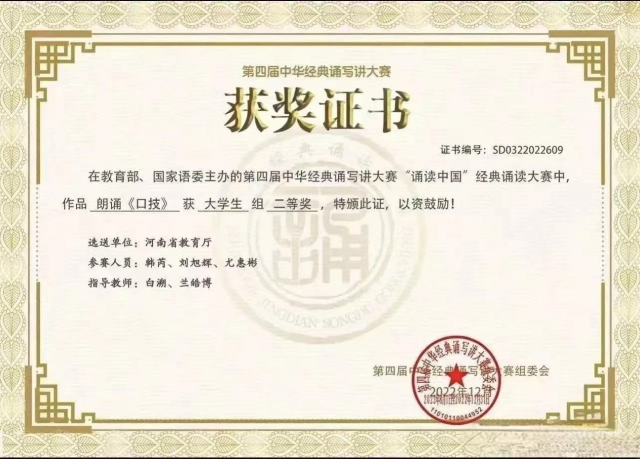 社团成员参与演出作品荣获过河南省第七届大学生艺术展演活动一等奖两项、河南省第一季“中华经典诵读大会”大学组二等奖、2023年文化和旅游部人才中心首届“华语行”朗诵大赛河南省一等奖,河南省第十九届大学生科技艺术节校园主持人大赛二等奖、最佳口才奖,河南省第六届中华经典诵写讲大赛大学生组一等奖、央广网“中华经典诵读大会”河南站大学组特等奖、二等奖等多项荣誉,在第七届中华经典诵写讲大赛中我团成员代表我校取得了在此赛事上最好成绩。社团成员还多次参演洛阳市组织的牡丹花会系列演出。(以下是部分获奖照片)