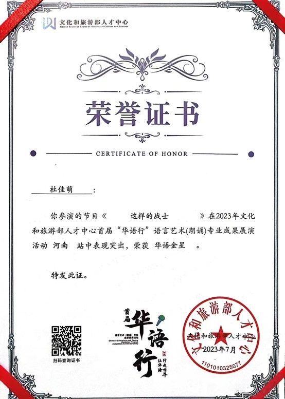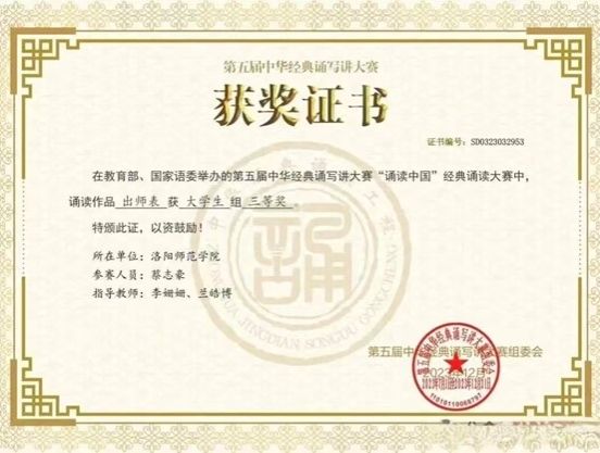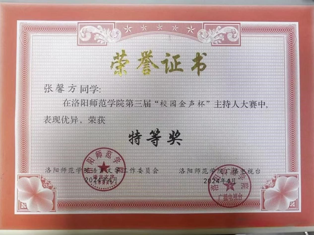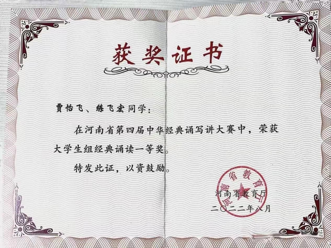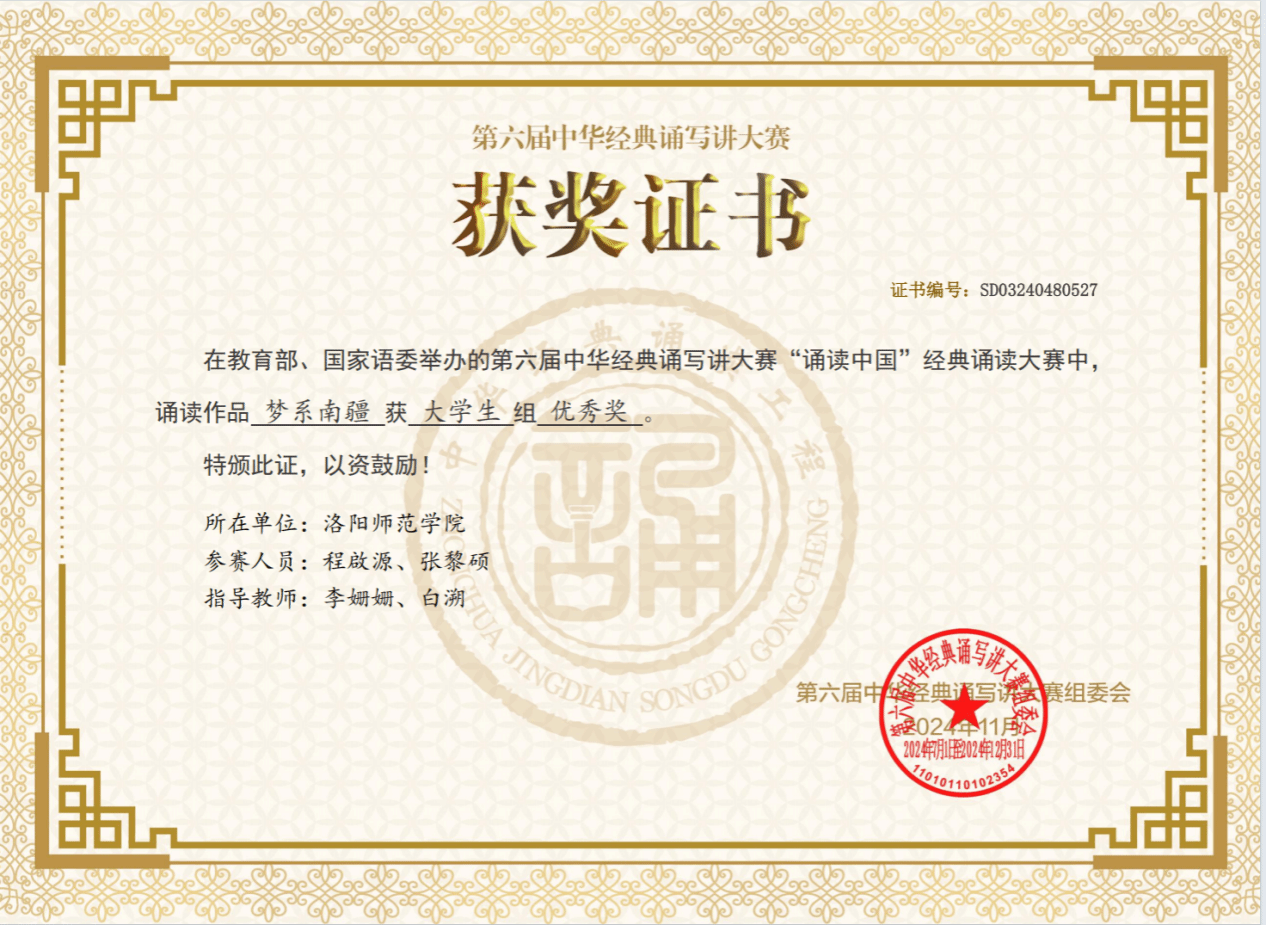 社团成员参与演出作品荣获过河南省第七届大学生艺术展演活动一等奖两项、河南省第一季“中华经典诵读大会”大学组二等奖、2023年文化和旅游部人才中心首届“华语行”朗诵大赛河南省一等奖,河南省第十九届大学生科技艺术节校园主持人大赛二等奖、最佳口才奖,河南省第六届中华经典诵写讲大赛大学生组一等奖、央广网“中华经典诵读大会”河南站大学组特等奖、二等奖等多项荣誉,在第七届中华经典诵写讲大赛中我团成员代表我校取得了在此赛事上最好成绩。社团成员还多次参演洛阳市组织的牡丹花会系列演出。(以下是部分获奖照片)
