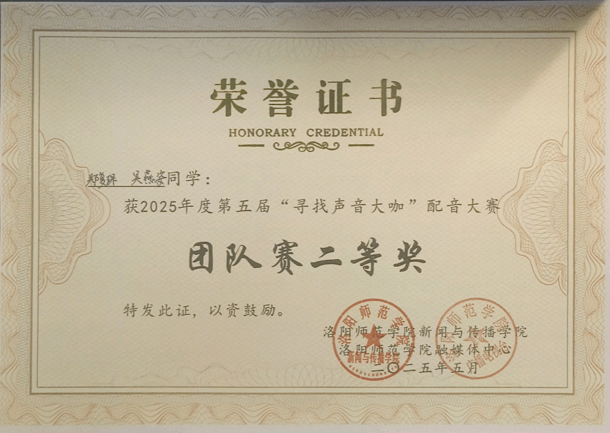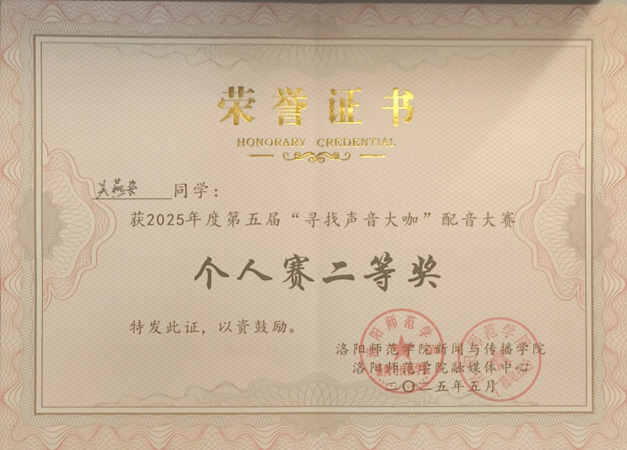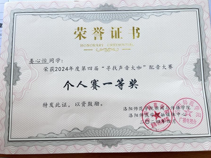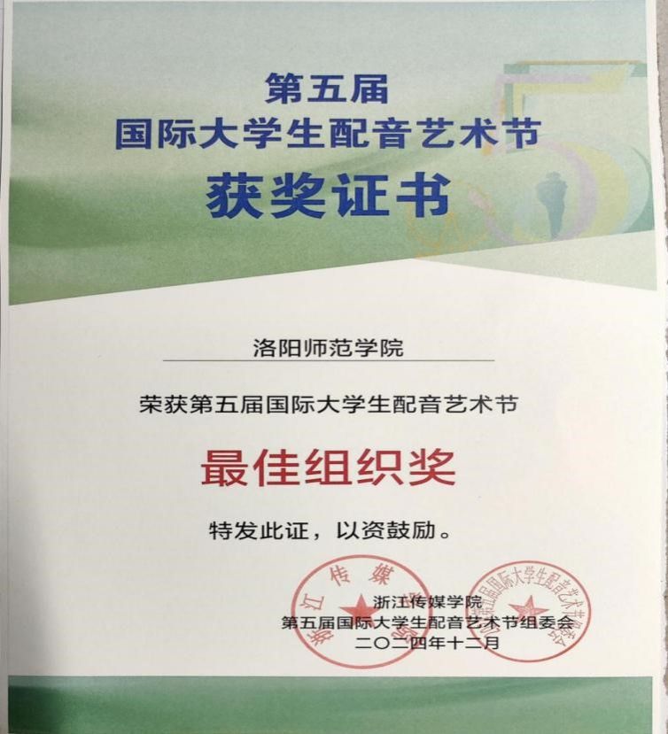 自配音社成立以来,每年都会参与多项全国配音赛事,成员在全国性赛事中屡获殊荣,累计投交作品超五百件,获奖人员近百人,其中一等奖六项、二等奖十六项、三等奖二十七项等。2024年12月,社团四支团队在指导老师白溯带领下,入围第五届国际大学生配音艺术节决赛,斩获国家级二等奖1项、三等奖3项,前社长于2024年斩获两项省级赛事一等奖,前副社长于这次配音艺术节斩获动漫赛道国家级二等奖,社员杜佳萌获第三届全国大学生配音大赛纪录片组一等奖、中国西部动漫节配音大赛奖项,社长获中国北部动漫节声优大赛奖项,社员的赛事荣誉体现了其扎实的专业能力与创新意识。社团亦通过承办校内选拔赛、孵化原创作品(如《北斗》《洛阳师院之声》),为成员提供高层次竞技比赛。