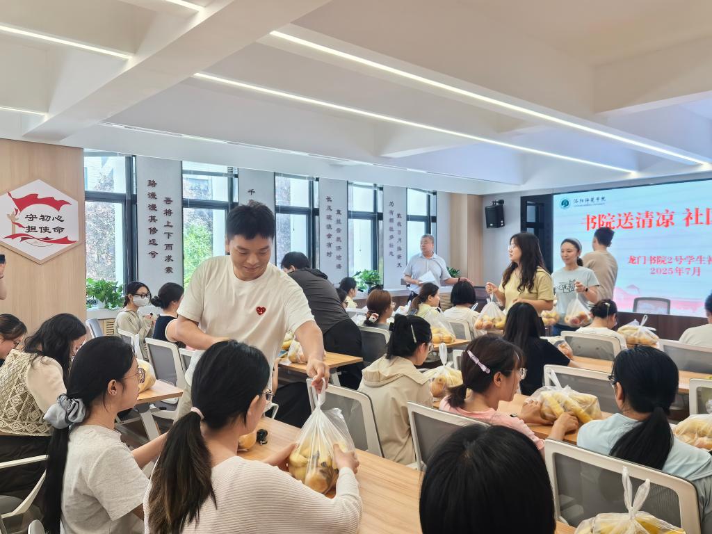 7月4日上午,龙门书院2号学生社区在崇学讲堂开展“书院送清凉,社区保安康”考研慰问活动,书院领导班子及全体育人导师齐聚一堂,向在炎炎夏日里坚持备考的留校考研学子送去清凉与关怀。