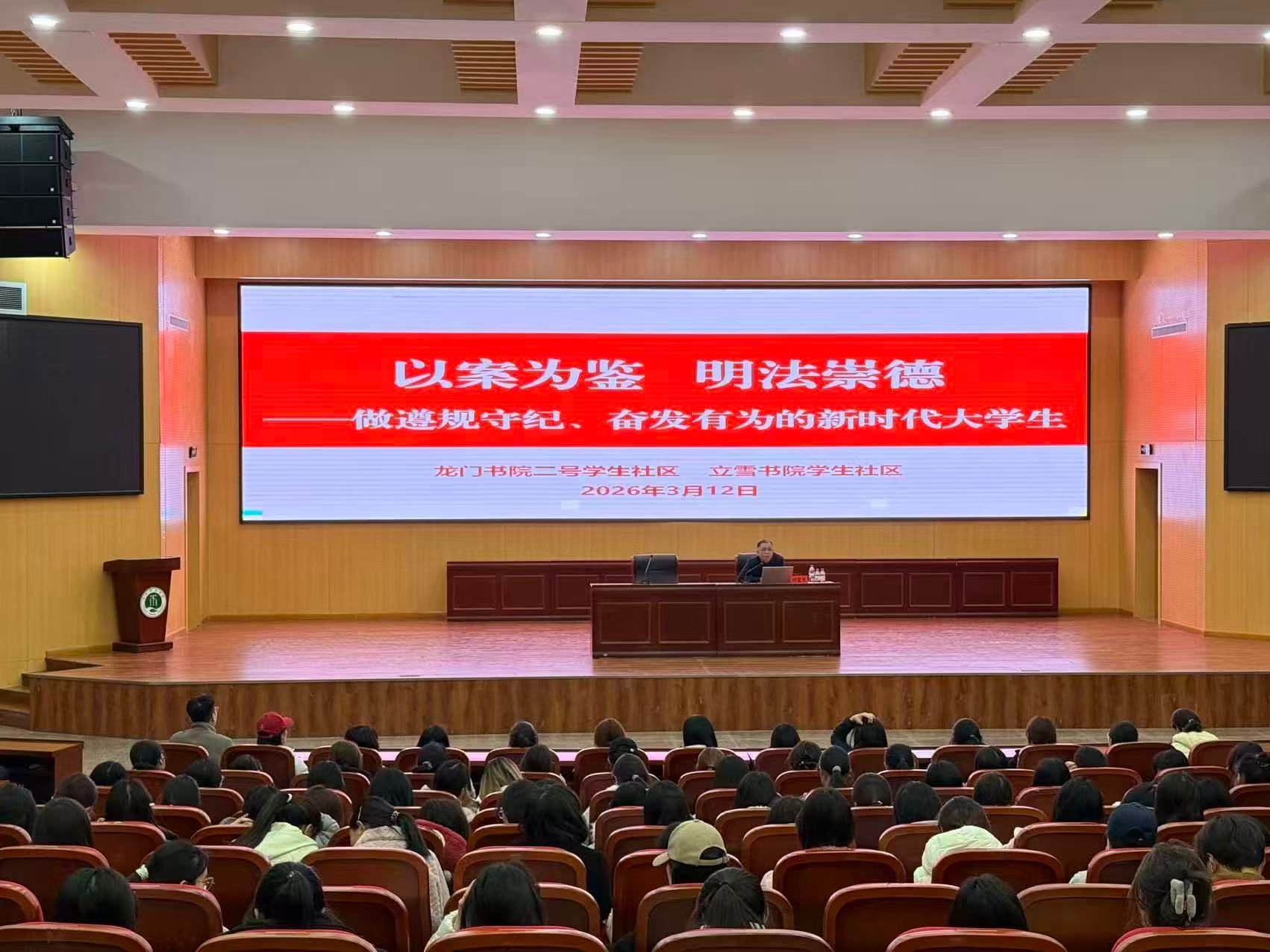 为进一步强化新时代大学生的道德修养与法治观念,引导青年学生明大德、守公德、严私德,树立正确的世界观、人生观、价值观,3月12日下午,龙门书院二号学生社区与立雪书院学生社区联合主办的大学生道德与法治教育专题讲座在逸夫教学楼G1-112报告厅顺利举行。活动特邀社会导师、河南都典律师事务所郑宝宝律师担任主讲,两个书院社区380余名学生到场聆听学习。