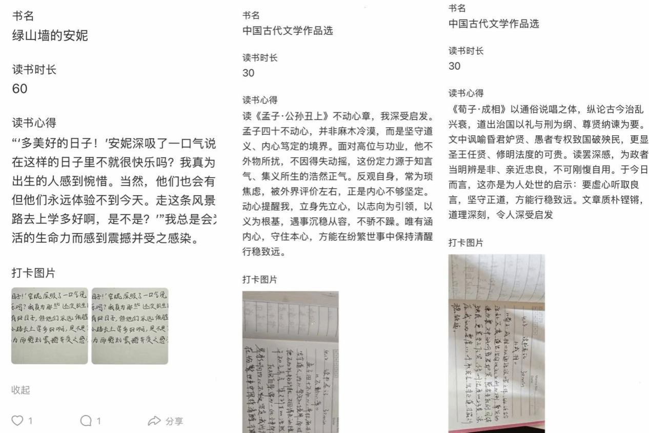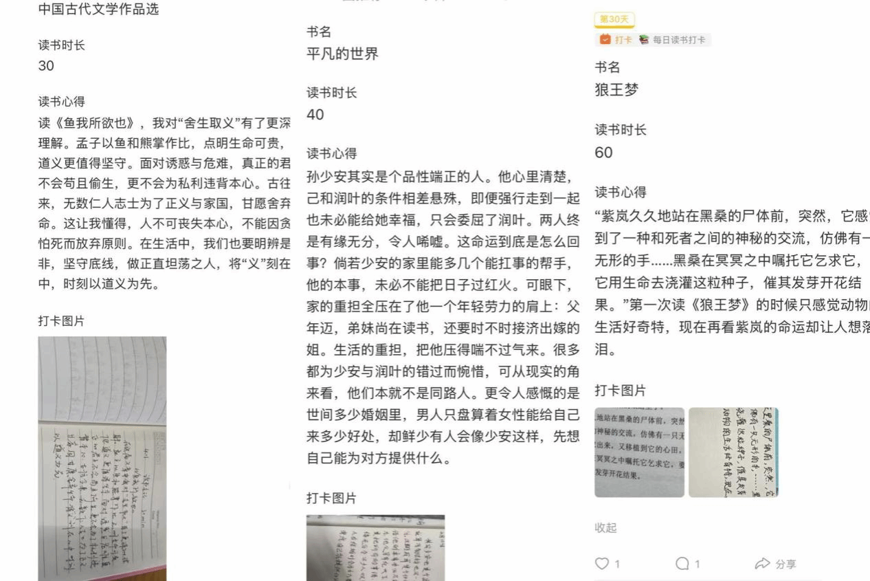 3月14日至4月14日,书院开展“青锋砺行 21天习惯养成”读书打卡活动。同学们通过微信“小打卡”小程序每日提交阅读记录,详细记录书籍名称以及手写的读书笔记或阅读感悟。大家在连续21天的打卡挑战中,或摘抄触动人心的段落,或写下与文字共鸣的思考,将阅读融入日常,在相互陪伴中交流阅读心得,分享阅读收获。
