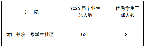 为进一步落实立德树人根本任务,鼓励学生奋发向上,发挥先进典型引导作用,根据《洛阳师范学院学生荣誉称号评定办法》(校发〔2025〕66号)文件要求以及《关于开展2026届毕业生校级评优工作的通知》具体工作安排,现开展龙门书院二号学生社区2026届毕业生校级评优工作。请毕业年级根据要求,认真做好本次评优评审工作。现将有关事项通知如下: