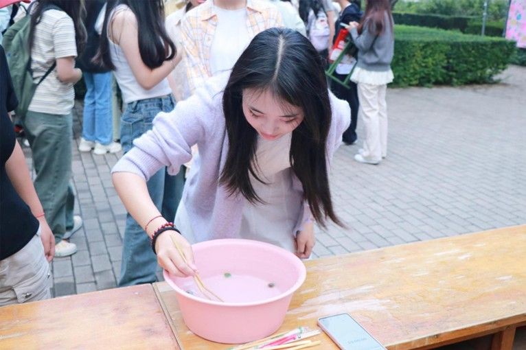 本次系列活动精心设计“猜灯谜”“海底捞月”“巧手制灯迎中秋”三个环节。傍晚时分,书院内院灯笼高挂,“猜灯谜”活动吸引众多同学驻足。谜题涵盖文化常识、诗词典故等,融趣味与知识于一体,同学们积极参与其中,现场互动热烈。“海底捞月”挑战区,参与者需用筷子夹起水中玻璃球,趣味竞技点燃欢乐氛围。“巧手制灯迎中秋”活动在此刻同步进行,学生们运用DIY材料创作灯笼,将优秀作品赠予书院教师传递感恩之情。