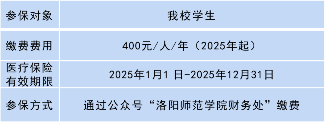 目前,洛阳市基本医疗保险制度包括两种类型:城镇职工医保和城乡居民医保两项基本医疗保险制度,覆盖了洛阳市全体城镇职工和城乡居民。我校全体学生统一参加洛阳市城乡居民医保。
