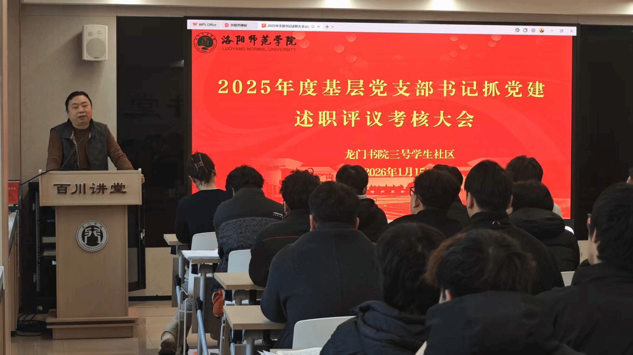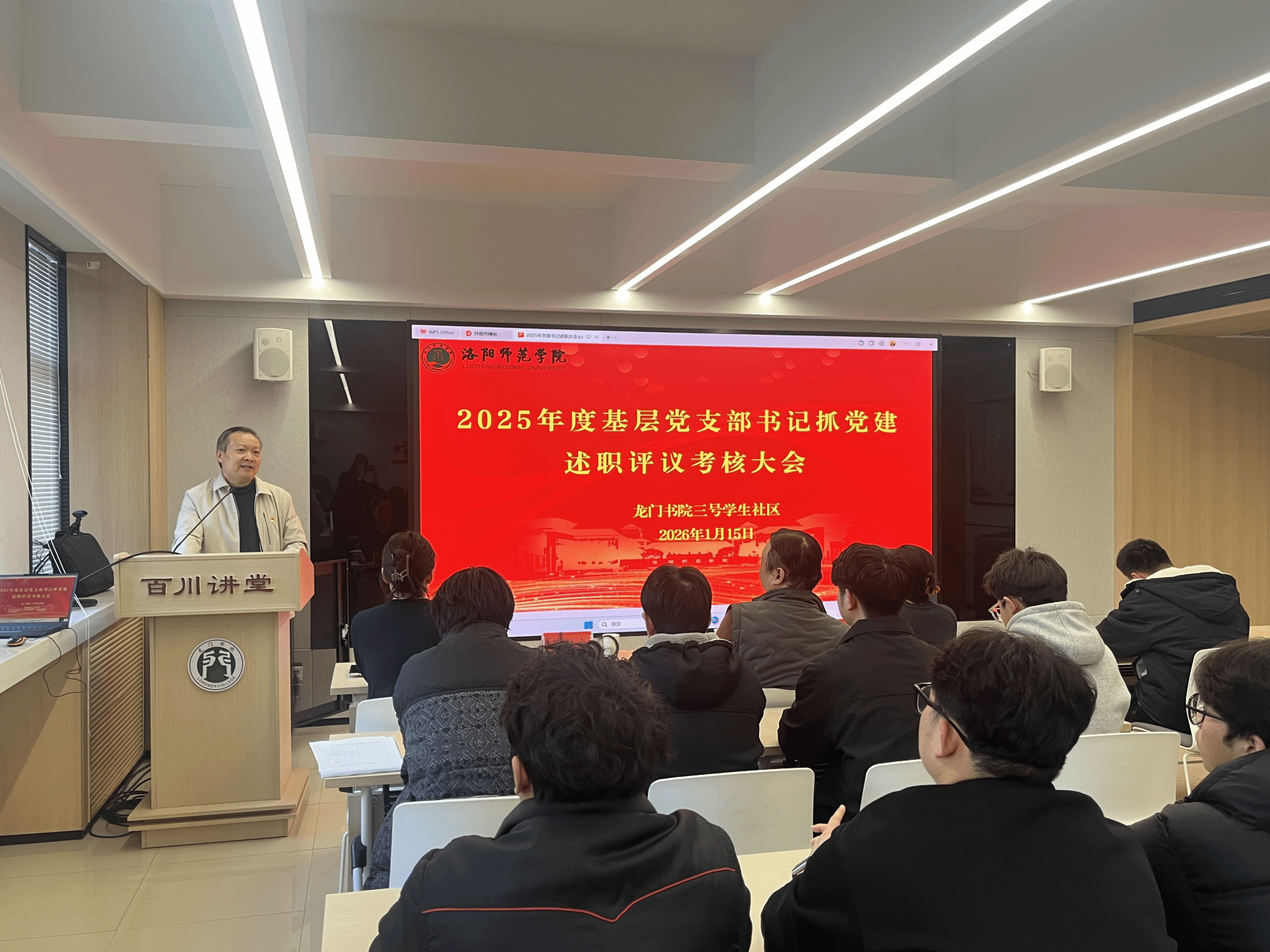 1月15日下午,龙门书院三号学生社区在百川讲堂举行2025年度二级党组织书记抓党建述职评议考核大会。书院党委书记董朝宗、院长翟丹、党委副书记马天天、党委副书记周银平出席,各支部党支部书记和全体师生党员参加会议。