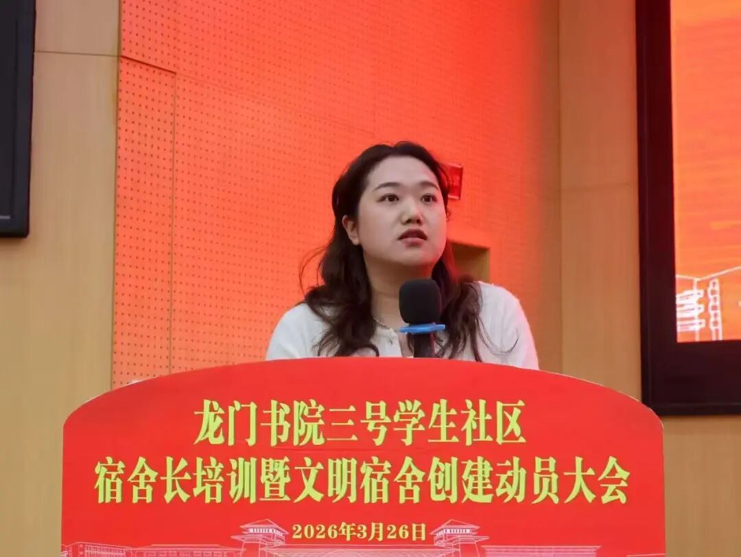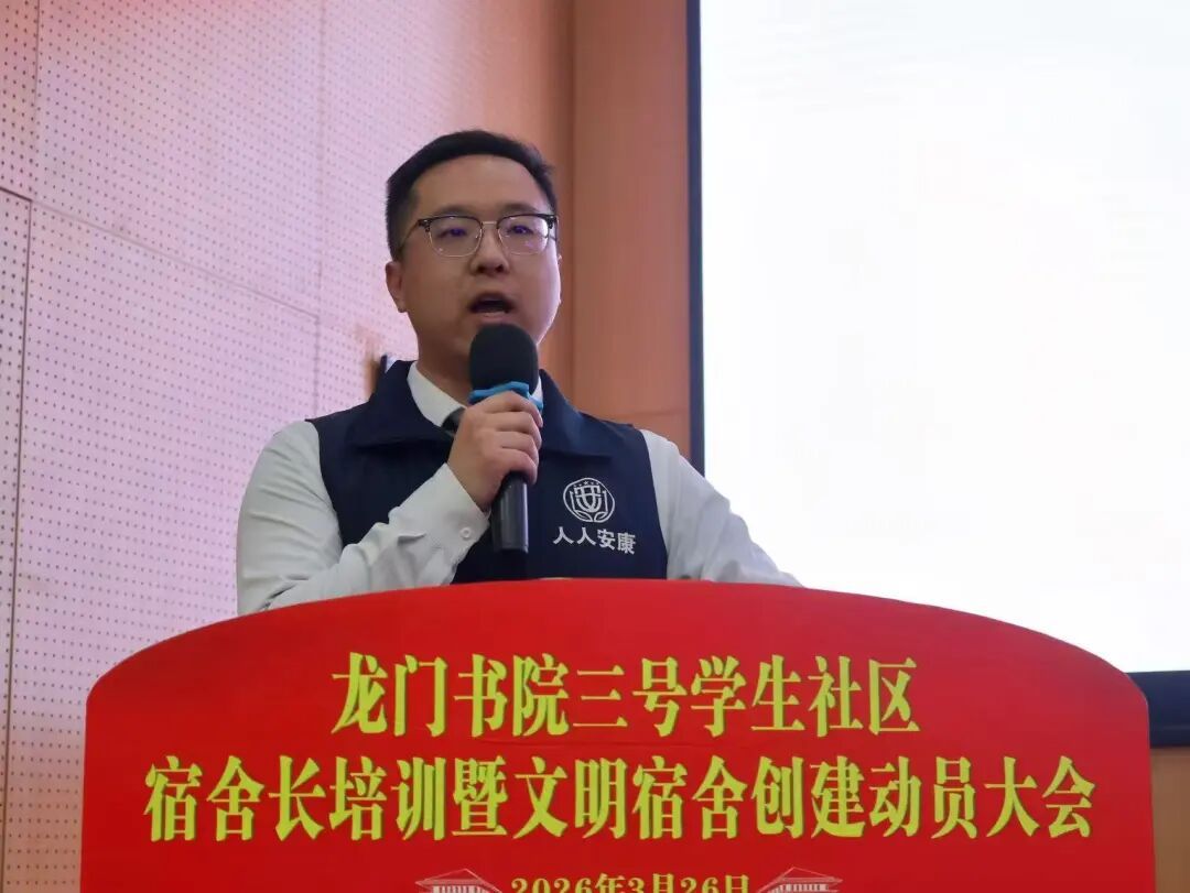 为深入推进“一站式”学生社区建设,提升宿舍长队伍履职能力,3月26日下午,龙门书院三号学生社区在逸夫楼G1-112会议室召开宿舍长培训暨文明宿舍创建动员大会。书院领导班子成员、全体育人导师及全体宿舍长参加会议。会议由书院党委副书记马天天主持。