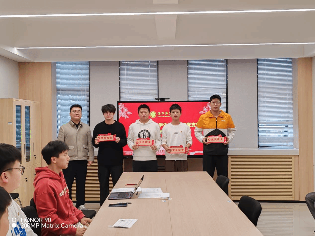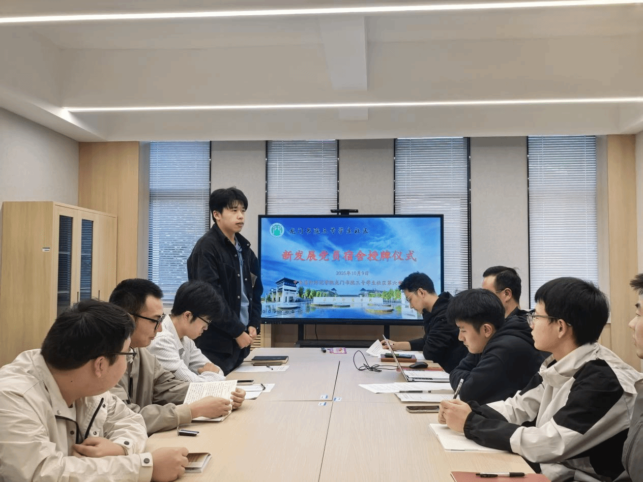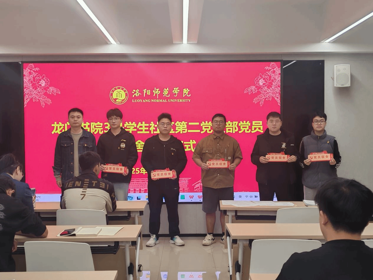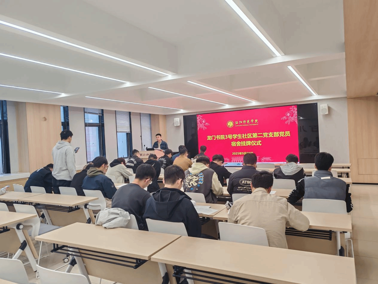 仪式现场,各支部宣读预备党员名单,组织新党员宿舍授牌和集体入党宣誓,并由党员代表交流体会。各党支部书记强调,党员宿舍挂牌不仅是一份“身份认证”,更是一份“责任承诺”。标识牌上清晰印刻的“党员宿舍”字样,既是对党员自身的公开提醒,也是向全体同学发出的服务邀约,旨在推动党员在宿舍生活中从“幕后”走向“台前”,成为学风建设的示范者、邻里互助的践行者、社区秩序的维护者。