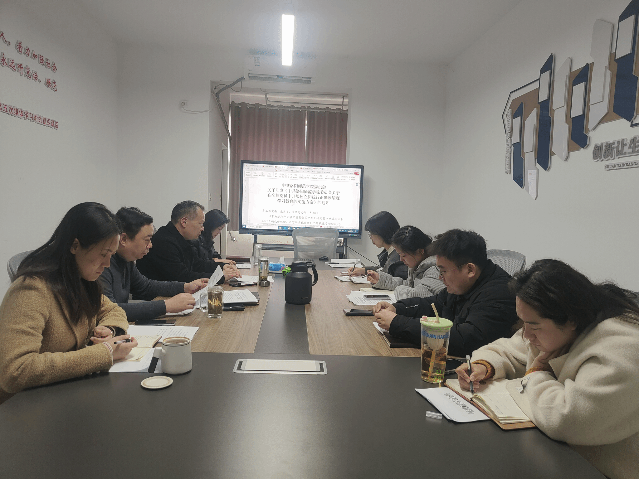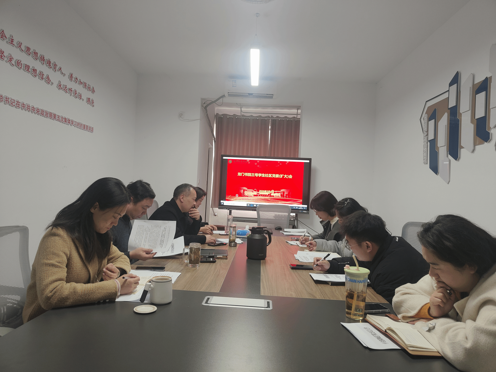 3月4日下午,龙门书院三号学生社区在书院3131召开党委扩大会议,深入学习贯彻习近平总书记关于树立和践行正确政绩观学习教育的重要讲话和重要指示精神,落实党中央决策部署和省委、学校党委工作要求,对书院开展树立和践行正确政绩观学习教育进行安排部署。书院社区党委书记董朝宗主持会议并讲话,党委委员、党支部书记及行政人员参加会议。