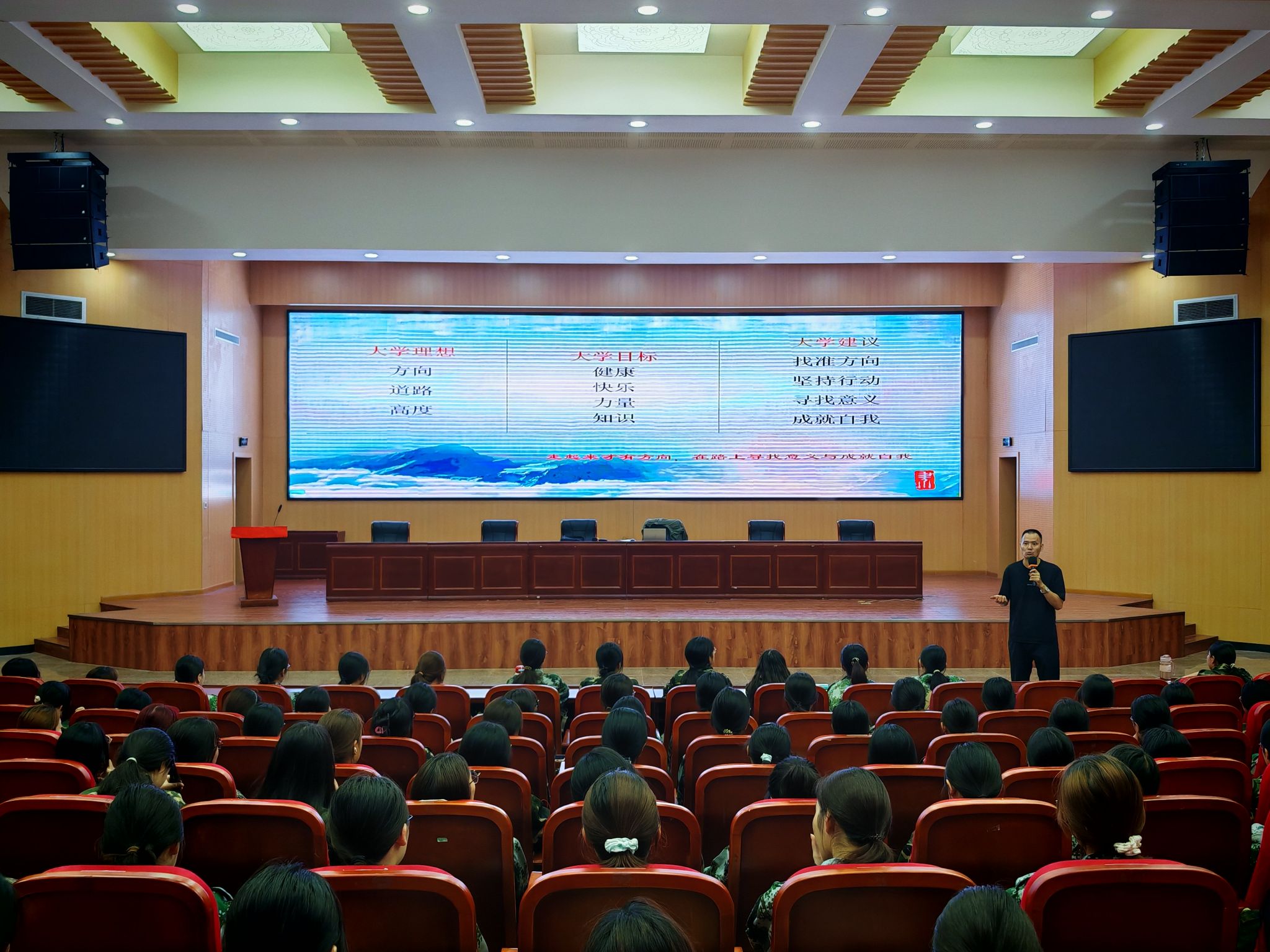 党委书记刘振中向新生致以诚挚欢迎,从双院协同、就业趋势、安全意识教育等维度展开讲授。他向新生提出殷切期许:一是要厚植家国情怀,主动将个人成长融入时代发展与国家需求,牢记青年是国家兴盛的关键力量;二是要在知识汲取中提升实践运用能力,实现学用相长;三是要在拼搏进取中突破自我,以奋斗之姿直面新时代挑战,砥砺前行。