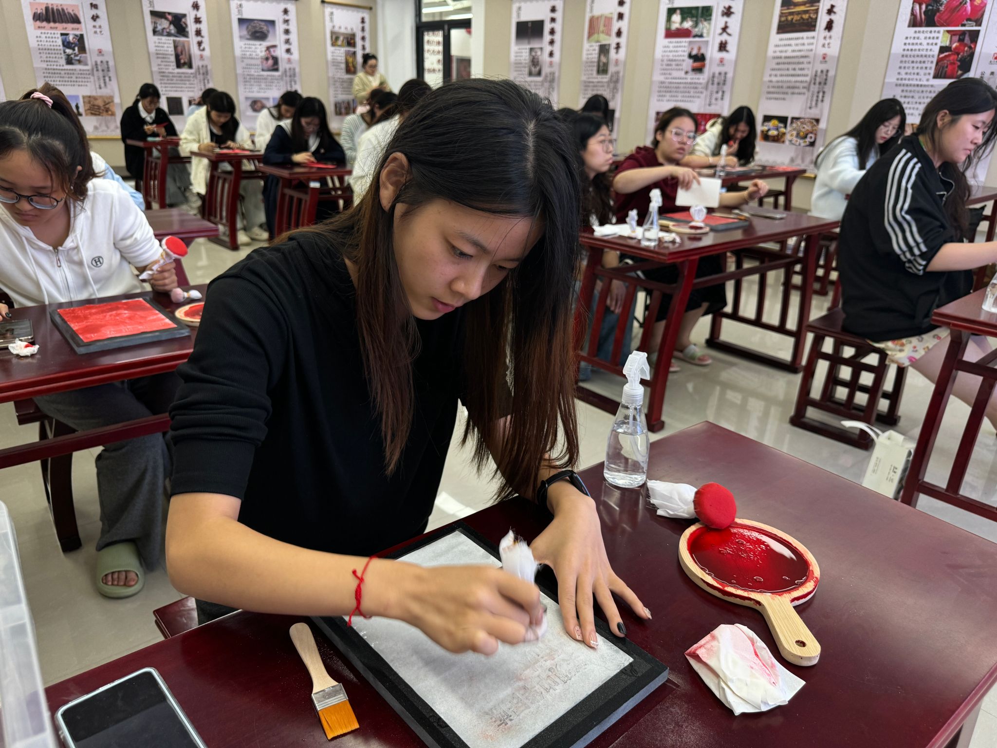 活动伊始,主持人简要介绍了拓印这项古老技艺的历史渊源与文化价值,并详细讲解拓印“轻蘸墨、匀按压”的核心技巧。随后,同学们动手实践,从上墨、铺纸到拓印,每一个步骤都认真细致、沉浸其中。在同学们的巧手创作下,一幅幅以国旗、华表、山河等为主题的作品逐渐呈现,与鲜艳的中国红元素相结合,焕发出崭新的时代光彩。现场墨香四溢,气氛热烈融洽。这些作品不仅展现了传统技艺之美,更凝聚了学子们对祖国繁荣昌盛、国泰民安最真挚祝愿。