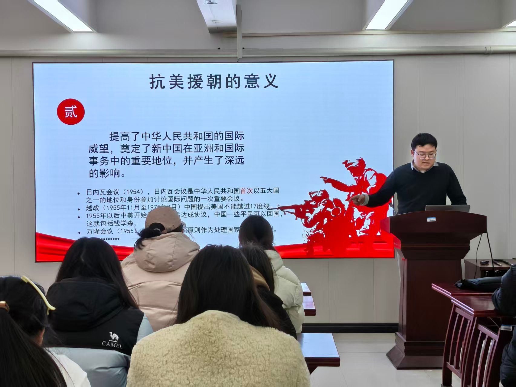 党课上,田卡吨以抗美援朝战争胜利75周年为契机,结合翔实史料与杨根思、黄继光等英雄事迹,生动讲述了志愿军以“钢少气多”的意志战胜强敌的峥嵘岁月,深刻阐释了以爱国主义、革命英雄主义为核心的伟大抗美援朝精神。他指出,作为中华民族的精神丰碑,抗美援朝精神所蕴含的不畏艰难、舍生忘死的担当品质,正是新时代推进国家发展战略过程中,青年党员亟需传承的精神财富。他围绕国家发展大局,深入阐述了青年党员在科技创新、基层服务、文化传承等领域的责任与使命,激励大家将个人成长融入国家发展,切实担当起强国兴邦的时代重任。