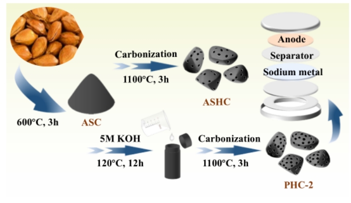 硬碳(HC)拥有较大的层间距、成本效益高、原材料来源广,且表现出比石墨更可观的高可逆比容量,被公认为是目前最有望商业化的钠离子电池(SIBs)负极材料。但其低的首次库伦效率(ICE)和差的倍率性能严重制约了其实际应用,成为目前急需解决的重点。因此,本团队分别选用价格低廉的碳前驱体如无烟煤、废弃杏壳、马铃薯淀粉,通过预氧化、KOH 活化、杂原子掺杂等不同改性方法,对其结构、元素含量进行调控,以获得高容量低成本的 SIBs 负极材料。
