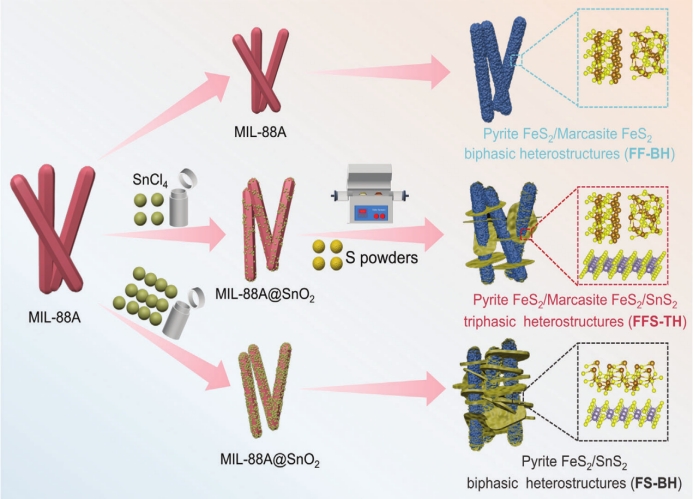 通过二次生长和硫化过程呈现了由黄铁矿(FeS2)、白铁矿(FeS2)和SnS2组成的三相异质结构FeS2/SnS2@C( FFS-TH ),作为高比容量、超稳定和快速充电负极材料。引入SnS2纳米片不仅构建了与FeS2微棒相结合的分级结构,以减轻体积膨胀并增加电荷存储的活性位点。Na3V2(PO3)3║FFS-TH全电池在1 A g-1下经过200次循环后容量高达618 mAh g-1,初始容量保持率为98.7%。可调节的三相异质结构的构建为实现理想的SIBs负极材料提供了一种新途径。