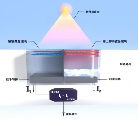 通过微晶玻璃量子剪裁优化、光路和电路设计、集成封装及软硬件技术提升,达到高效宽频日盲探测,兼顾环保、成本、简单原则,实现应用推广。