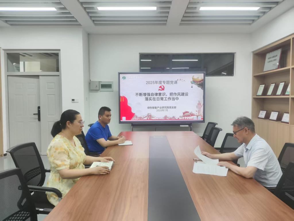 2025年7月2日下午,绿色智能产业研究院党支部书记、院长冯勋为支部全体党员讲授就深入贯彻中央八项规定精神学习教育讲授专题党课“不断增强自律意识,把作风建设落实在日常工作当中”,引导党员同志进一步强化纪律意识,不断增强自律意识,把作风建设落实在日常工作当中,推动学习教育落实落地。