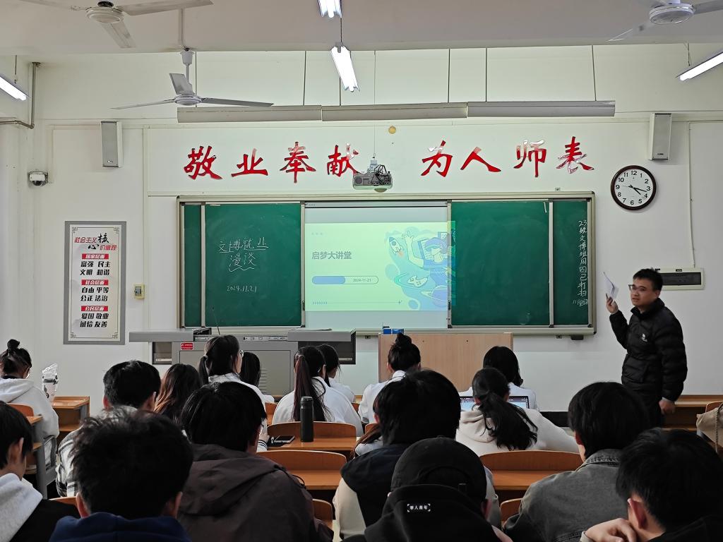 为切实推进就业创业工作,给学生提供更多的就业创业指导,11月21日下午,由招生就业处主办,历史文化学院承办的主题为“文博就业漫谈”的启梦大讲堂在A4-303举办。本次讲座由历史文化学院魏龙星老师担任主讲人,22、23级文物与博物馆学专业学生参加。