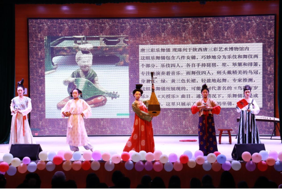 晚会在乐器演奏《霍元甲》中拉开帷幕。舞蹈《书简》中舞者衣袂翩然,手持书卷腾挪辗转,水袖翻飞间,勾勒出文人雅士以书会友的诗意场景,把古典意蕴化作灵动舞姿;《礼仪·成人礼》借庄重典雅之冠礼、笄礼,于观众眼前徐徐铺展礼乐文明的璀璨画卷,少年束发为冠,少女簪缨加笄,在礼乐声中完成生命的庄重蜕变;《唐俑》采用文物复原的方式把文物带上舞台,真正“让收藏在博物馆里的文物、陈列在广阔大地上的遗产、书写在古籍里的文字都活起来”,当珍藏于各大博物馆的画卷徐徐展开,五位姿态各异的少女在一颦一笑中尽显大唐风采;古筝独奏《大鱼》琴音空灵,似海浪翻涌,带观众遨游神话意境;短剧《琵琶行》将观众拉回浔阳江头的那个夜晚,再现了唐代社会的风貌与历史情感,传承华裳与经典文化之美;舞蹈《寄明月》将流行元素融入汉服文化,青春韵律里,展现传统与现代的奇妙碰撞;走秀《衣脉·越千年》以汉服形制演变为脉络,直裾、深衣、襦裙、褙子、马面裙等依次登场,表演者身着不同朝代代表性汉服走秀,搭配历史解说,清晰勾勒出华夏衣冠的发展轨迹。服饰色彩从古朴到绚丽,款式从简约到繁复,无声诉说时代变迁与文化传承。社团倾情放送的彩蛋《盛唐夜唱》将全场气氛推向高潮。