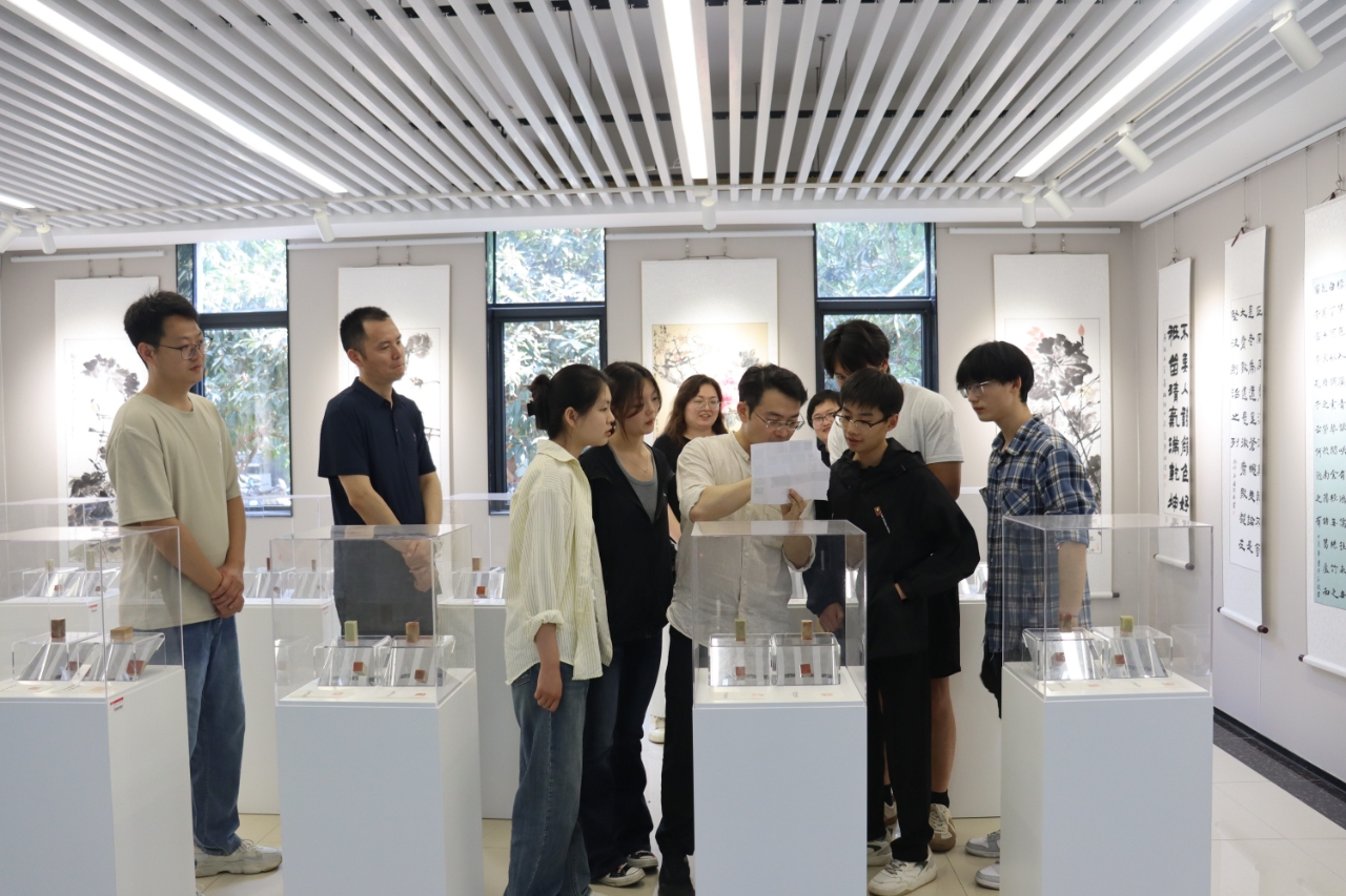 在鸿都书院2号学生社区印石作品展示区,数十方学生篆刻作品线条流畅、构思精巧。美术与艺术设计学院书法系主任杨孟一带领师生走进篆刻艺术天地,从风格流派到篆刻刀法细致讲解,鼓励学生取法乎上、持之以恒。