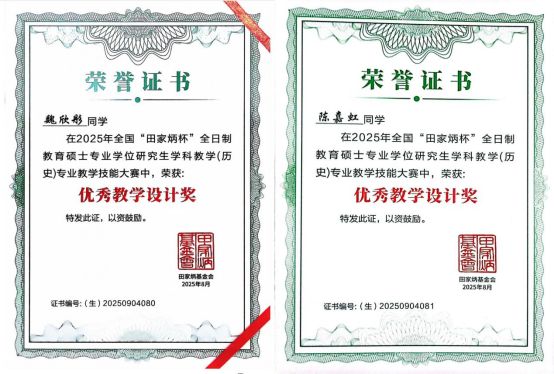 历史文化学院叶思雨老师带队,我院2024级学科教学(历史)专业硕士研究生魏欣彤、陈嘉虹同学均荣获三等奖及“优秀教学设计奖”。