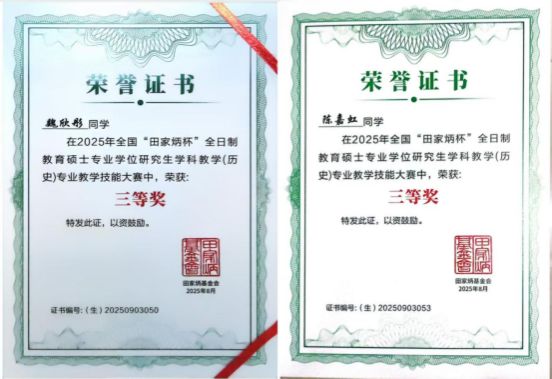 此次获奖不仅是对两位同学个人能力的肯定,也是我院教育硕士培养质量的重要体现。近年来,学院持续深化师范教育教学改革,强化“以赛促学、以赛促教、以赛促建”机制,全面提升学生的教学实践能力和综合素养。未来,学院将继续以高水平竞赛为抓手,推动学科教学研究生培养质量持续提升,为培养新时代优秀历史教师贡献力量。