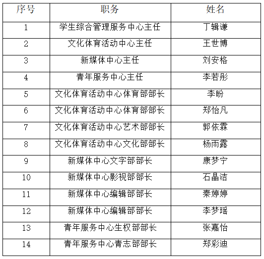 为引导和激励我院学生发扬服务奉献精神,把握时代脉搏,贡献青春力量,进一步加强历史文化学院学生综合管理服务中心组织建设,充分发挥青年先锋的模范带头作用,学院本着公平、公正、公开的原则,经个人申请、资格审查、公开竞选、综合评定等环节,现将本届换届名单予以公示: