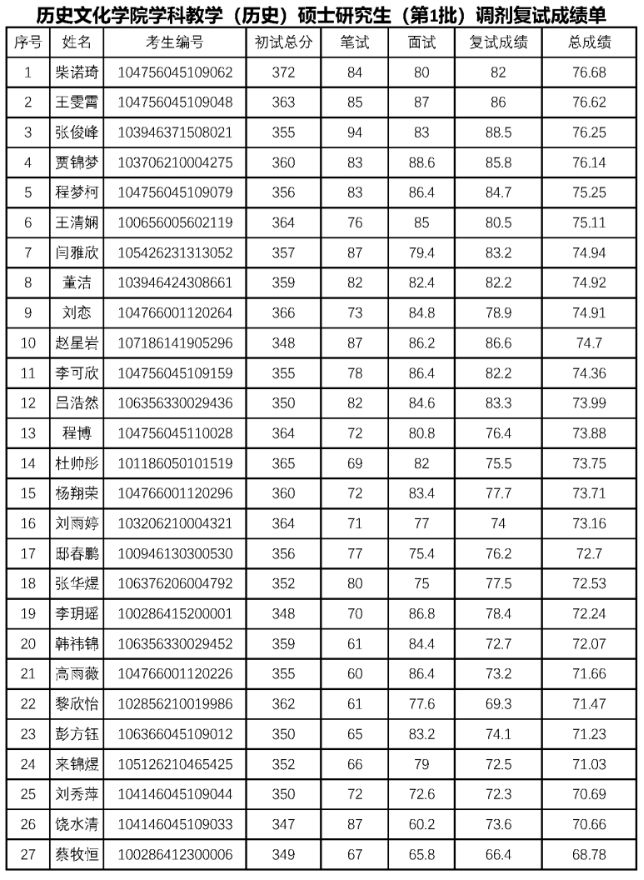 根据教育部《2026年全国硕士研究生招生工作管理规定》(教学函〔2025〕2号)、《洛阳师范学院2026年硕士研究生复试录取工作办法》等文件精神,我院于2026年4月12日组织开展了2026年硕士研究生复试工作。经专业课笔试、外语能力测试、综合素质面试等环节,已全部完成2026年我院研究生招生复试(调剂)工作,复试成绩已报学校审核备案,现公示如下: