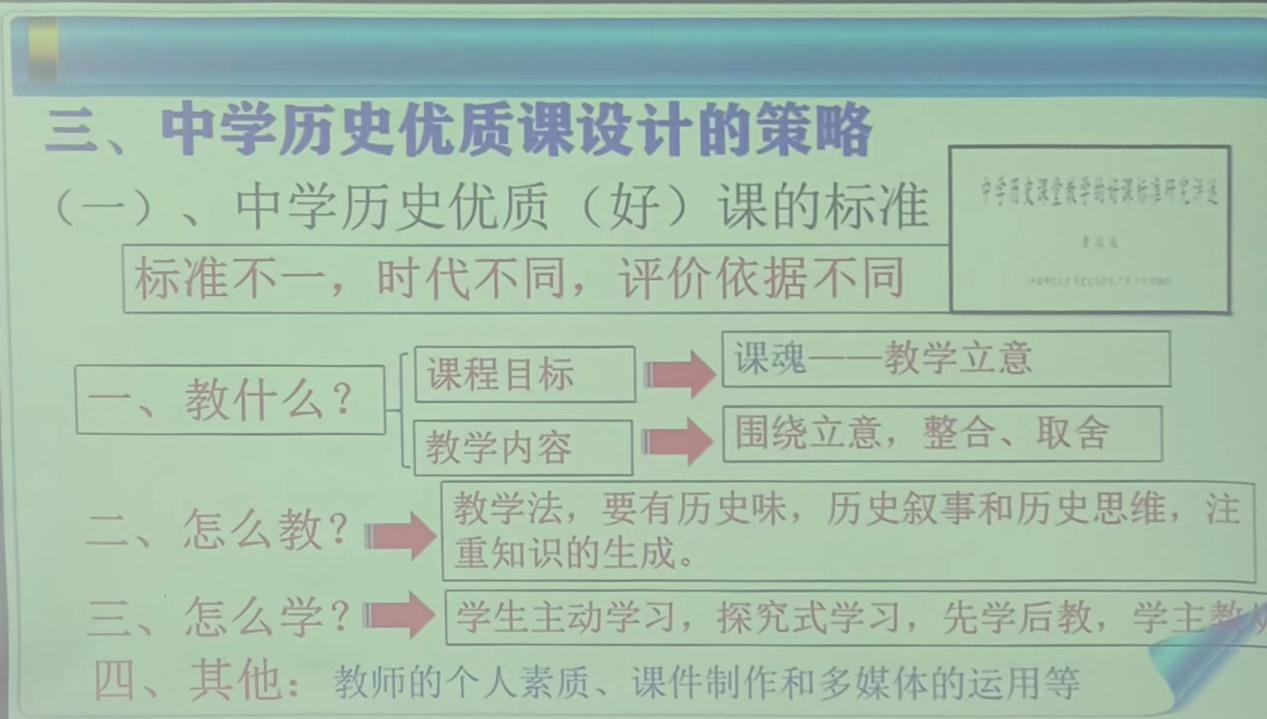 其次,对五大学科核心素养——唯物史观、时空观念、史料实证、历史解释和家国情怀的概念及关系以及在初高中历史课标中的具体体现进行系统解读,指出唯物史观是认知的立场,时空观念和史料实证是方法、途径,历史解释是认知的目的,家国情怀是认知的价值追求。并就新课程改革对历史教学的影响作出解答,要求同学们以进一步落实立德树人的育人目标为导向,以培养学生学科核心素养为核心,进行以学生为本的教学,转变课堂教学模式和学习方式,从教“教材”进步到用“教材”教。江老师还就教学目标的设计做了更深一层的解释,要求同学们围绕学科核心素养制定教学目标、单元目标和课时目标,倡导大单元、大概念主题式教学。接着,江老师介绍了中学历史优质课设计的策略。