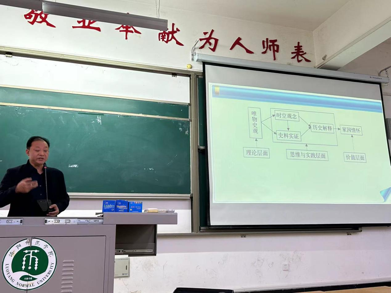为进一步提高学生的教学设计能力,推进学院师范专业认证工作,2023年11月9日,我院特邀洛阳市教师发展中心高中教研部历史教研员江正军举办《新课程改革下中学历史优质课的设计》的讲座。讲座由徐芳亚副教授主持,21级历史学本科生和23级学科教学(历史)研究生聆听了此次讲座。