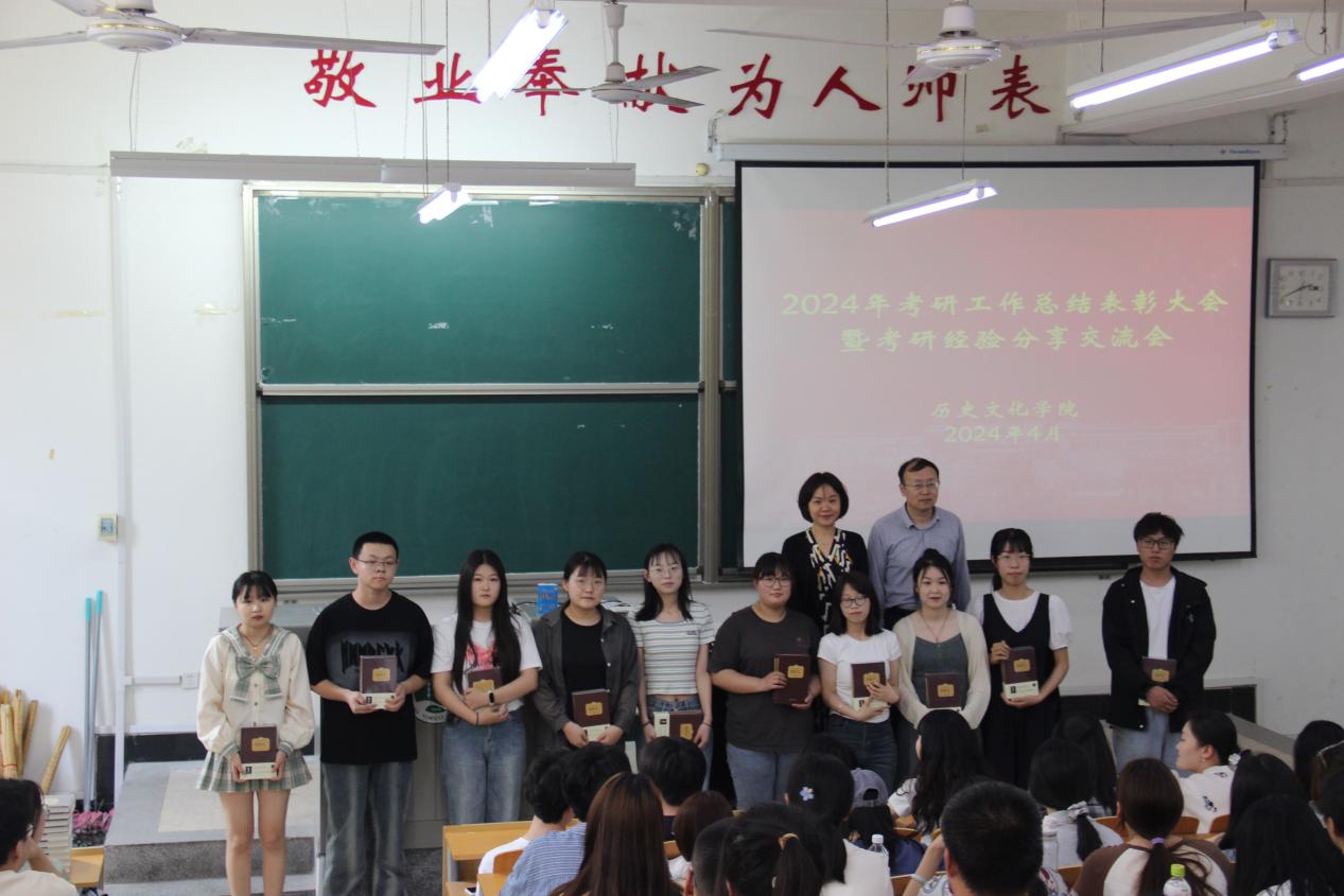 张忠详细了历史、文博、文产三个专业各自的考研录取统计,肯定了学院的考研成绩,也指出了学院考研率与学校整体考研率尚有微小差距,表示学院考研工作还有很多潜力有待发掘,希望其他届的同学能够坚持不懈,敢于拼搏。表示学院一贯非常重视考研工作,实时举行考研讲座,鼓励同学们要勤学苦练、虚心请教,在报考学校和专业时咨询学业导师和班主任,合理安排复习计划,争取早日考取成功。最后,郭炳洁、张忠为2024届考研录取学生颁发纪念品并与获奖学生合影留念。