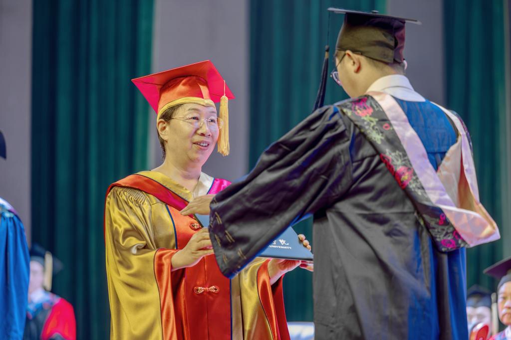 在欢快的乐曲声中,毕业生代表走上典礼台。校党委书记郭改英教授为获得硕士学位的毕业生代表正冠拨苏并授予学位;为受表彰的毕业生先进个人代表颁发荣誉证书。党委副书记、校长郭海明教授为获得学士学位的毕业生代表正冠拨苏并授予学位。