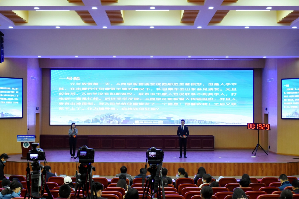 经过初赛、复赛的激烈比拼,共有10名辅导员进入决赛。决赛紧扣辅导员工作实际,设置案例研讨、谈心谈话、理论宣讲三个环节。案例研讨环节主要考察辅导员综合运用理论分析问题、研判问题、解决问题的能力;谈心谈话环节主要考察辅导员对相关理论政策、学生特征、学生成长成才规律的了解把握以及对问题的解决能力和对学生的教育引导能力;理论宣讲环节主要考察辅导员对大学生开展理想信念教育、中国特色社会主义和中国梦宣传教育、爱国主义精神的理论宣传阐释能力。