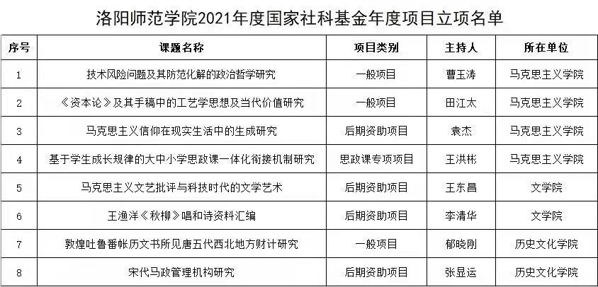 近日,经全国哲学社会科学工作领导小组批准,全国哲学社会科学工作办公室陆续公布了2021年国家社科基金年度项目、后期资助项目和高校思政课专项项目立项名单,我校共有8项课题获得立项资助(具体立项名单见下图),包括一般项目3项,后期资助项目4项,专项项目1项。其中国家社科基金后期资助项目我校立项数量位居全省第4,取得历年最好成绩。