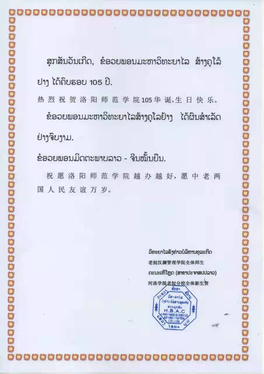 在我校迎来105岁生日之际,老挝汉澜管理学院和河洛学院(老挝分校)全体师生来信传递美好祝福,他们在信中写到:“热烈祝贺洛阳师范学院105华诞,生日快乐。祝愿洛阳师范学院越办越好,愿中老两国人民友谊万岁。”