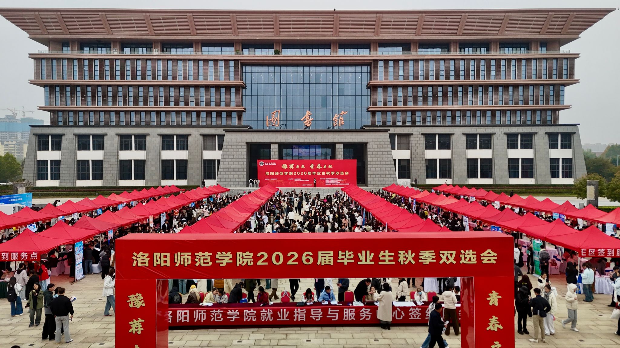10月25日,由河南省教育厅主办,洛阳师范学院、洛阳市人力资源和社会保障局承办的“豫荐未来·青春启航”2026届毕业生秋期双选会在图书馆南广场举行。本次双选会共邀请全国316家用人单位现场招聘,提供就业岗位超过1.5万个,1.3万余名学生到场参会,收到简历1.7万余份,意向签近2000人。