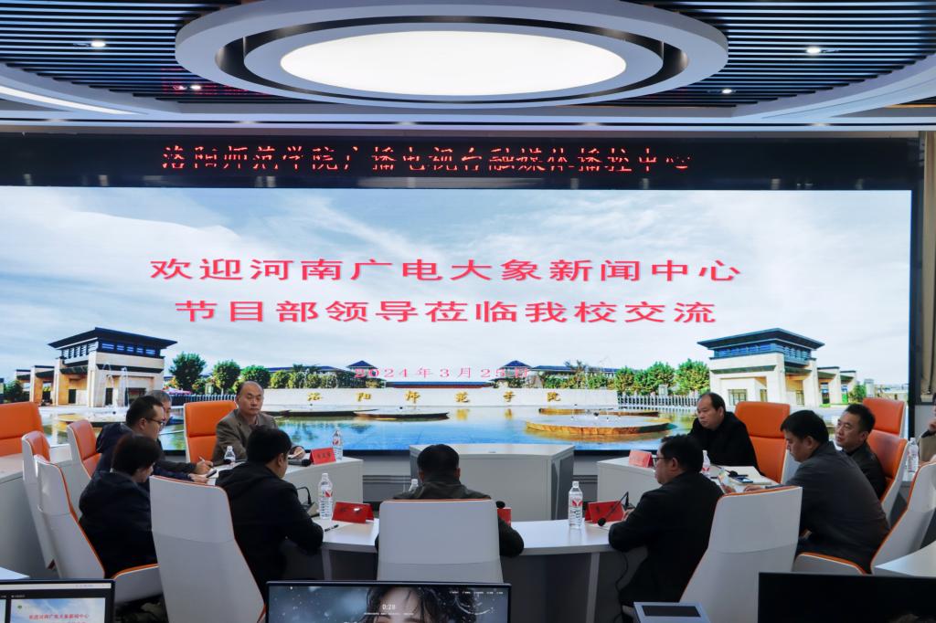 随后,双方在融媒体播控中心进行了深入交流研讨,围绕下一步合作共创做出了积极部署。索秋平对河南广电大象新闻邢军一行的到来表达欢迎,并简要介绍了我校办学情况、科研成果与未来发展规划。索秋平表示,在媒体融合时代,河南广电引领省级媒体占据第一方阵,希望日后能继续推进校媒融合发展,不断加强我校与河南广电大象新闻集团的交流与合作。
