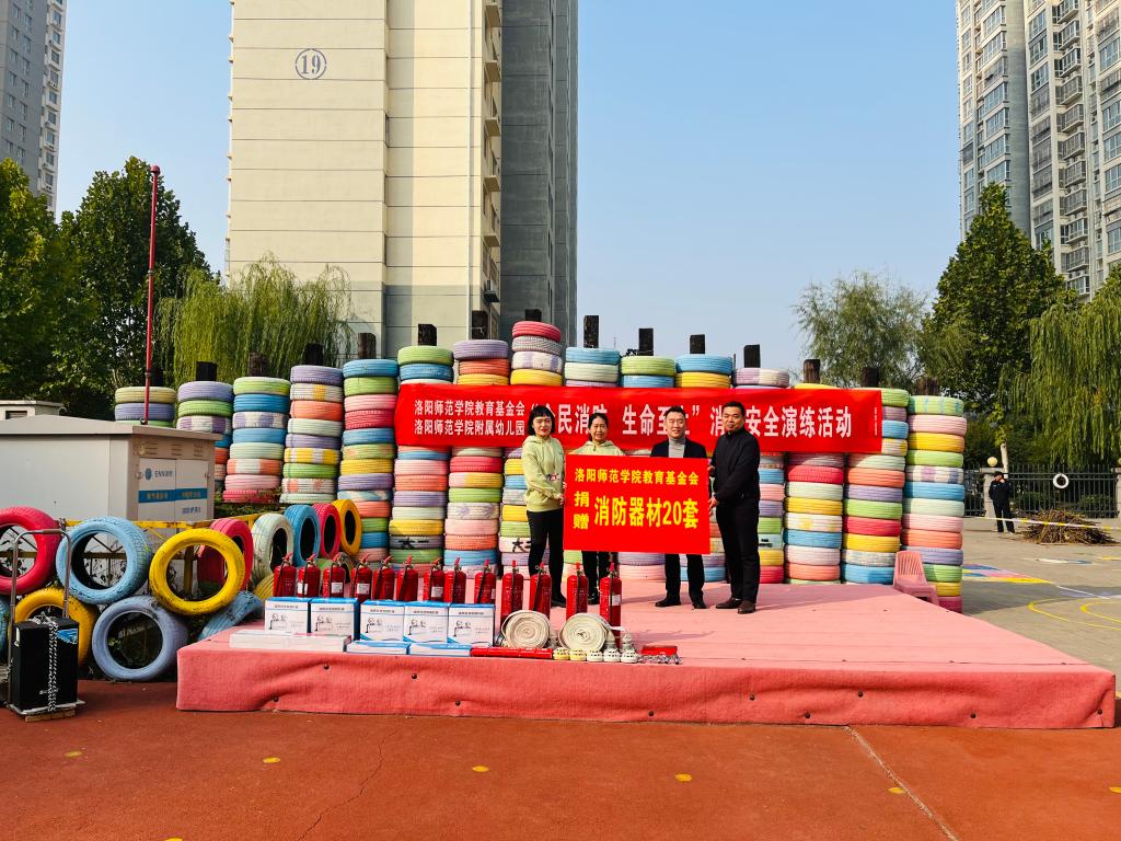 随后,杜胜利代表洛阳师范学院教育基金会向附属幼儿园捐赠灭火器、照明灯、探测器、报警器、水带等一批消防器材,以实际行动传承公益精神、勇担社会责任,为孩子们的健康成长保驾护航。他表示,小朋友是祖国的未来,是家庭的希望,在孩子们幼小的心灵中种下安全意识的种子,教会他们如何在紧急情况下保护自己,是每一位教育工作者和社会各界共同的责任。希望通过这次活动,进一步加强基金会与幼儿园之间的合作与交流,共同为孩子们的成长撑起一片安全的天空,让安全之花在每一个孩子心中绽放。
