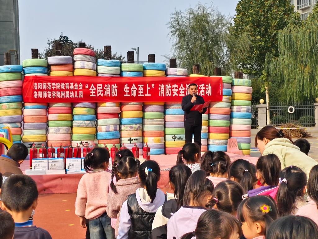 2024年11月9日是第33个“全国消防日”,为大力普及消防安全知识,培养幼儿消防安全意识,11月8日上午,洛阳师范学院教育基金会走进洛阳师范学院附属幼儿园,与200余名师生一起,共同开展“全民消防 生命至上”消防安全演练活动。洛阳师范学院教育基金会办公室主任郭可悫,教育基金会办公室副主任、基金会秘书长杜胜利,洛阳师范学院附属幼儿园园长张惠参加活动。