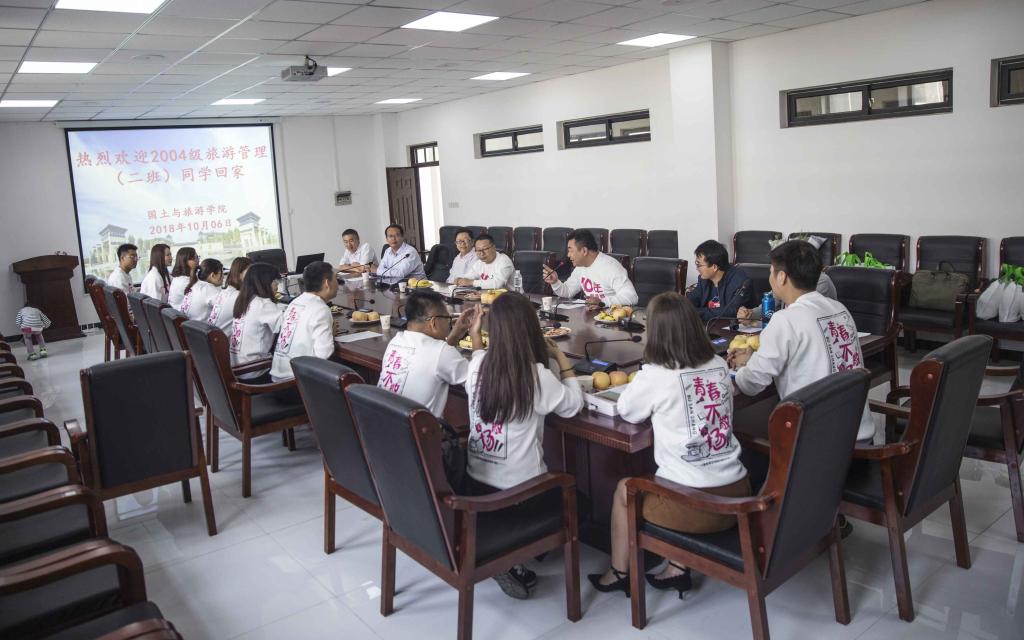 十年再聚首,青春不散场。十一假期,我院2004级旅游管理班毕业生十年聚会,重回母校。10月5日上午,一辆大巴车驶入国土与旅游学院门前,2004级旅游管理班毕业生在班长翟盛光带领下走下车,走向早早在此等候的老师们。学生代表将一束鲜花送给当年的辅导员韩学伟老师,并与韩老师一一握手。