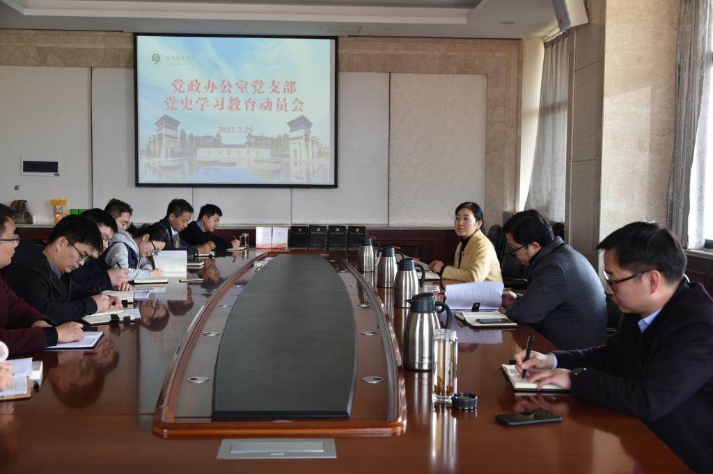 3月25日下午,党政办党支部在B302会议室召开党史学习教育动员会,支部全体在校党员参加会议。会议由支部副书记贾艳丽主持。