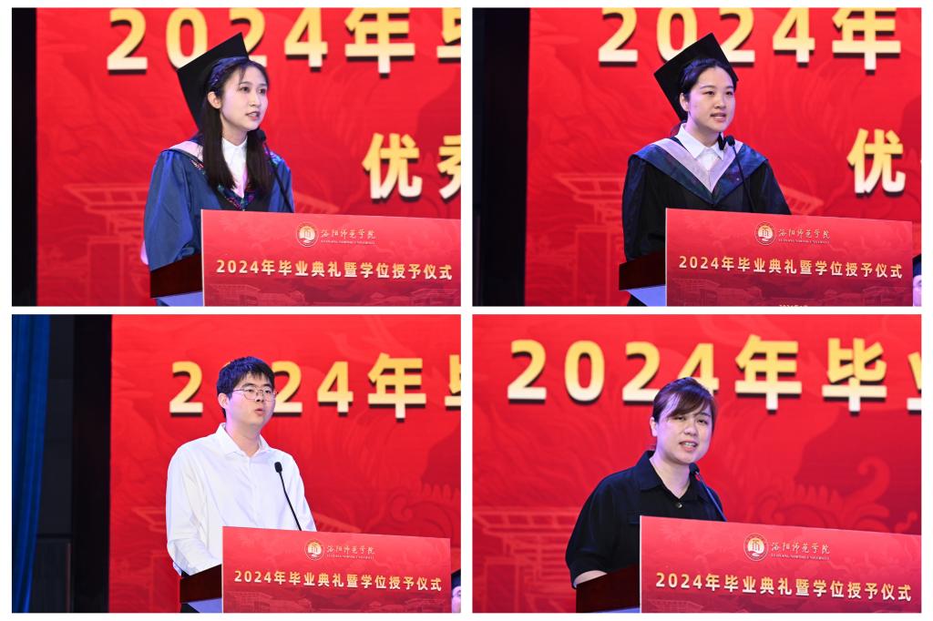 优秀硕士毕业生代表李思懿、优秀本科毕业生代表刘晨、在校生代表彭淇、教师代表文学院教师刘知萌先后发言,分别表达了毕业学子对母校的感激之情和全体教师对2024届毕业生的美好祝愿。