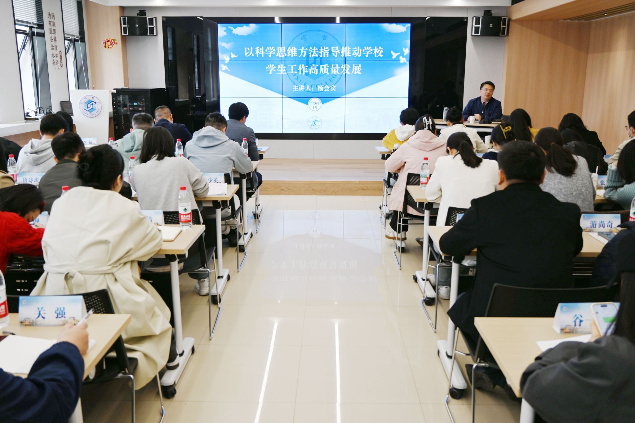 杨会宾以《以科学思维方法指导推动学校学生工作高质量发展》为题,从思维方法、实践路径、能力素养三个维度展开,系统阐释了战略思维、历史思维、系统思维、辩证思维、创新思维、法治思维、底线思维七种科学思维方法的内涵、要求,强调要提升学生工作的科学性、预见性、主动性和创造性。在日常工作中,要强化政治意识、学习意识、规范意识、总结意识和落实意识,坚持以“有利于学生成长成才、有利于事业高质量发展、有利于学校安全稳定”为目标,主动担当作为,助力学生成长成才。