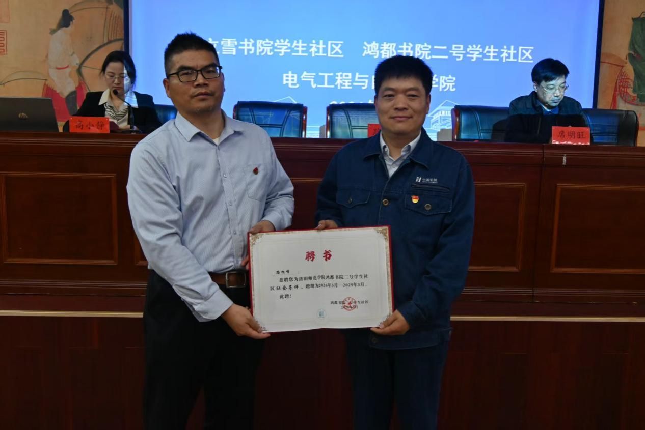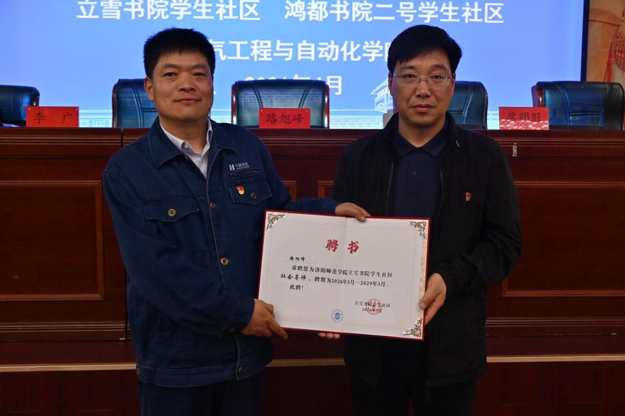 立雪书院和鸿都书院积极探索育人新路径,特聘请路旭峰担任学生社会导师,立雪书院学生社区党委书记席明旺和鸿都书院二号学生社区李广为其颁发社会导师荣誉证书。
