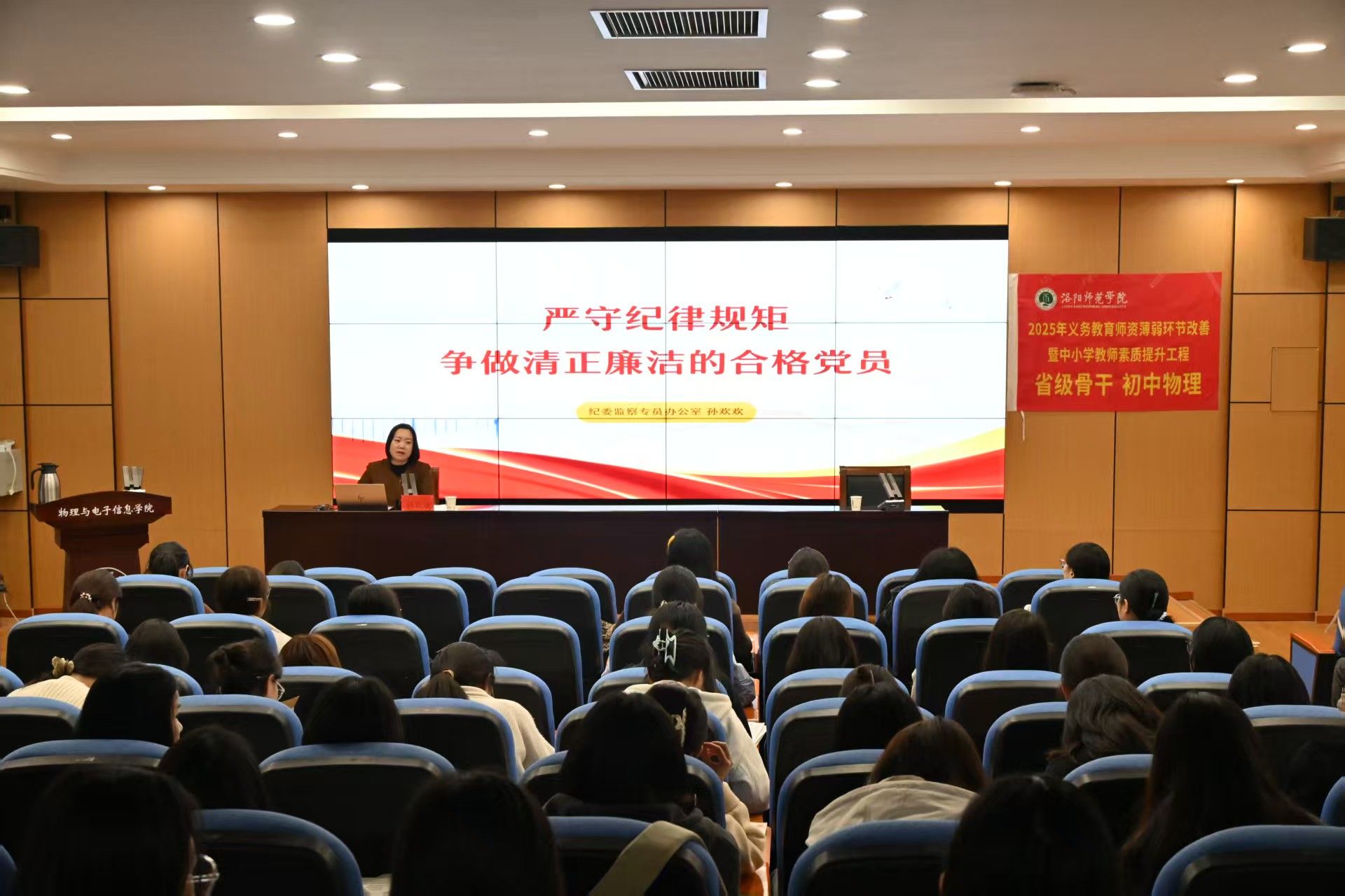 10月28日晚,立雪书院学生社区在物理楼102报告厅开展“严守纪律规矩,争做清正廉洁的合格党员”主题党课培训。洛阳师范学院纪委监察专员办公室主任孙欢欢主讲,立雪书院学生社区党委副书记高小静主持,2025年下半年全体入党积极分子参加。