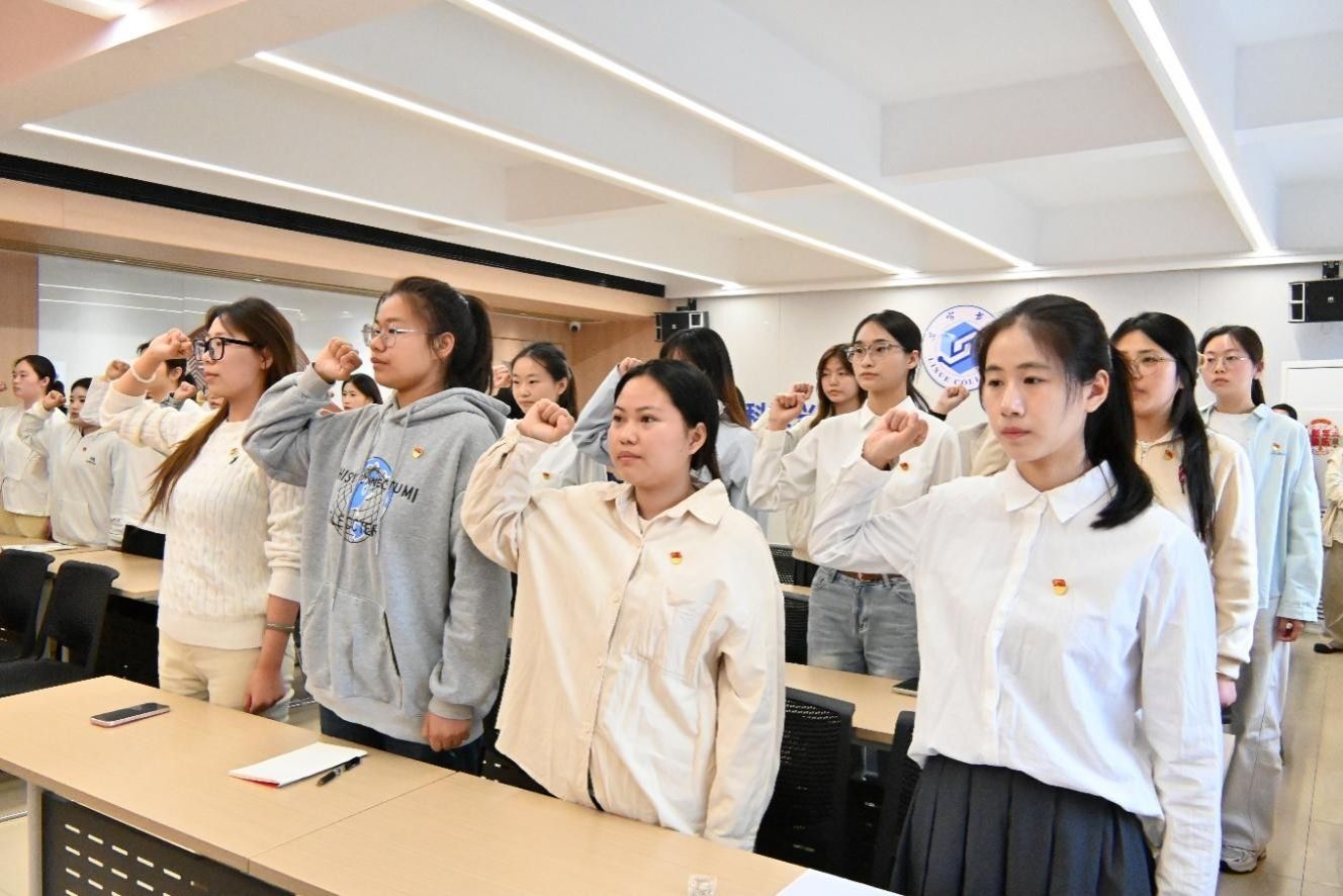 仪式在庄严的国歌声中拉开序幕,立雪书院学生社区党建与思政办公室主任冯静静宣读了关于接收刘吉祥等43名同志为中共预备党员的决定,并公布新党员名单。随后,各党支部书记为新党员逐一佩戴党员徽章。面对鲜红党旗,全体预备党员高举右拳,庄严宣誓。