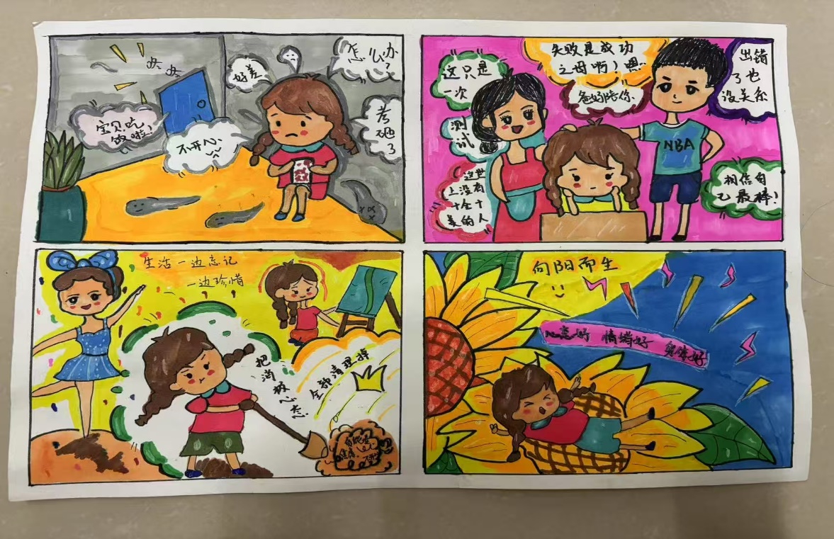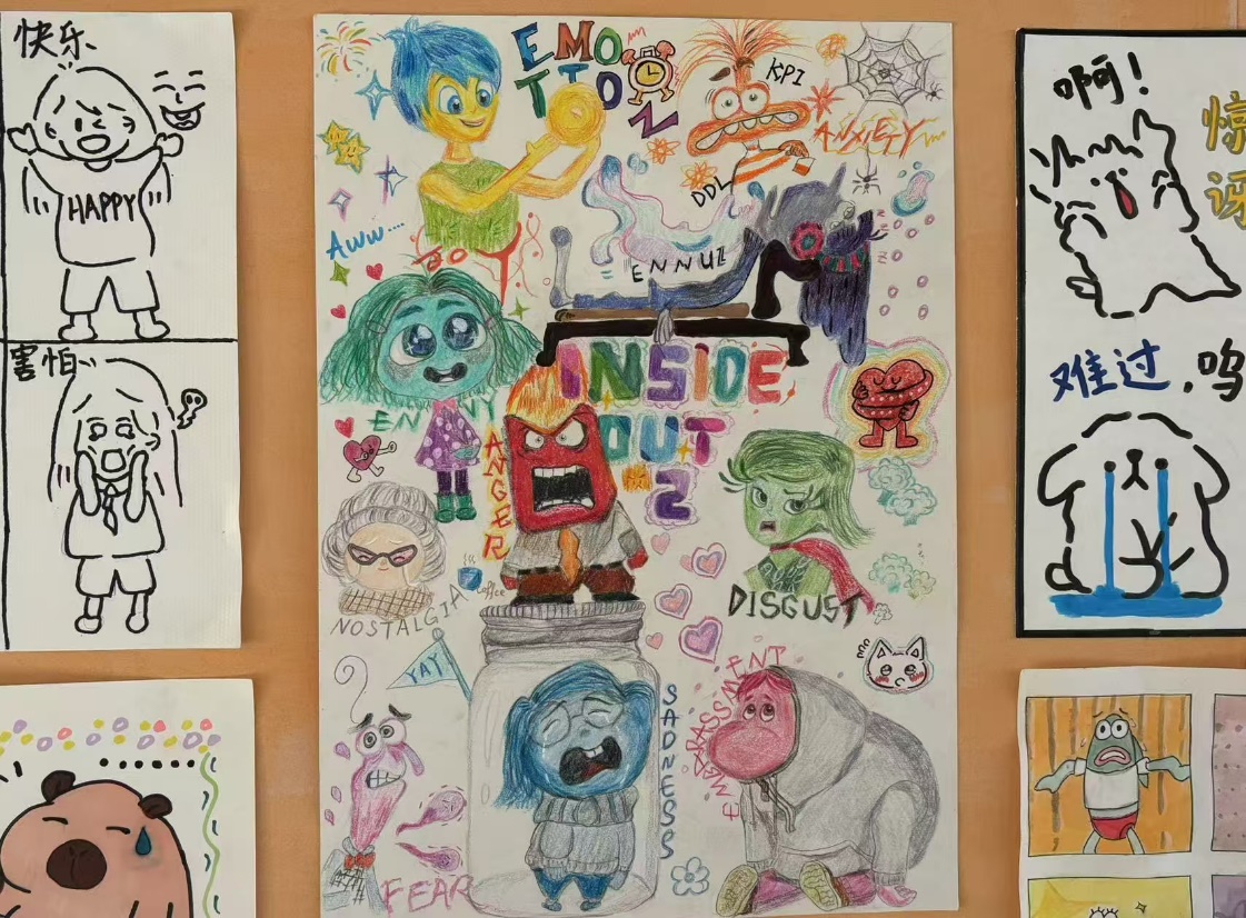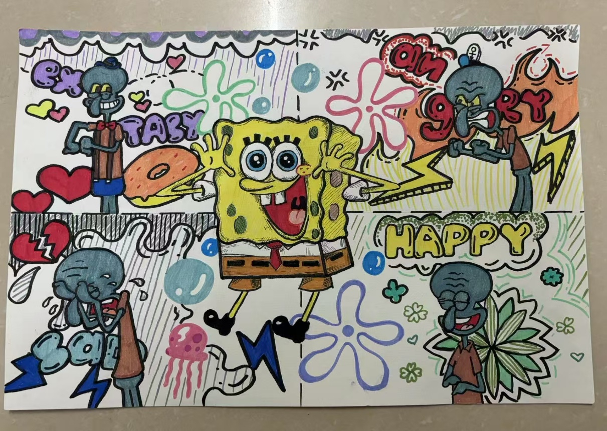 绘画过程中,参与者将情绪分为开心、难过、愤怒等板块,进行情绪宫格的绘画创作,同学们充分发挥想象力,用画笔将内心情绪具象化,创作出一幅幅风格各异、情感饱满的作品。收集作品后,立雪书院学生社区心理健康中心结合作品的创意性、表现力以及对情绪的精准表达,从众多作品中精心筛选出一批优秀作品,并将评选出的优秀作品精心布置,进行集中展示,吸引了众多师生驻足观赏。