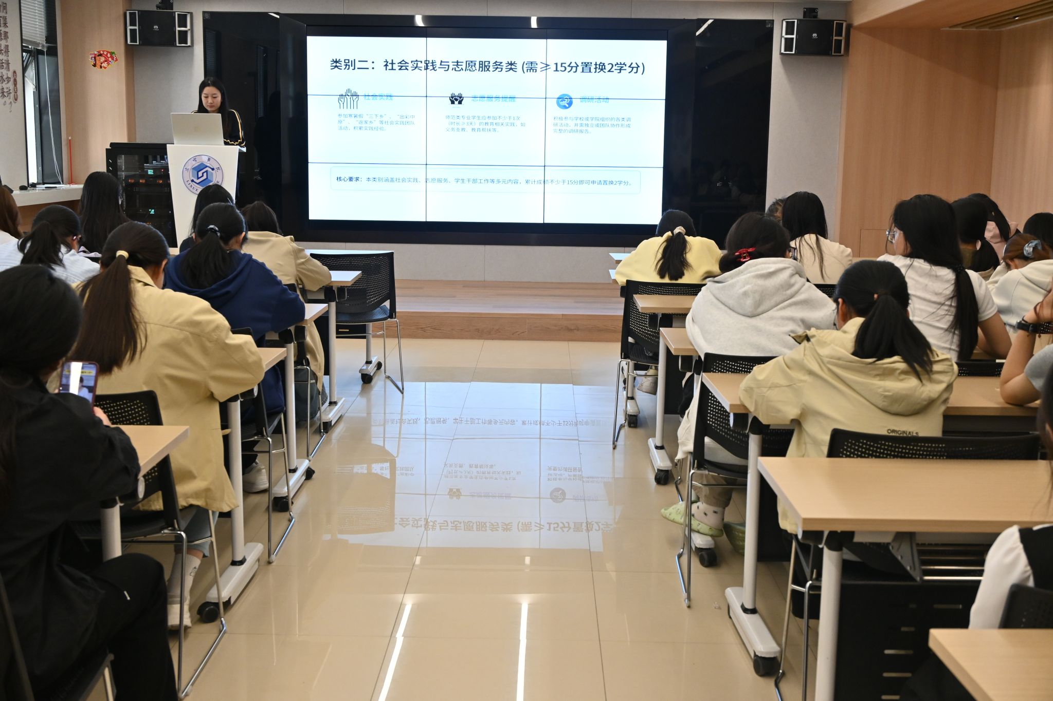 高潇潇结合2024级起须修满5个第二课堂学分方可毕业的硬性要求,详细解读了五大类别学分构成与置换规则。她重点强调思想政治与综合素养、社会实践与志愿服务两类学分为限选模块,科研创新与学科竞赛、文体艺术与身心发展、课外阅读与知识拓展等三类学分为选修模块,各块需达到规定分值方可置换学分。她提醒同学们应以学业为基,合理规划,使第二课堂真正成为提升综合能力的有力平台。
