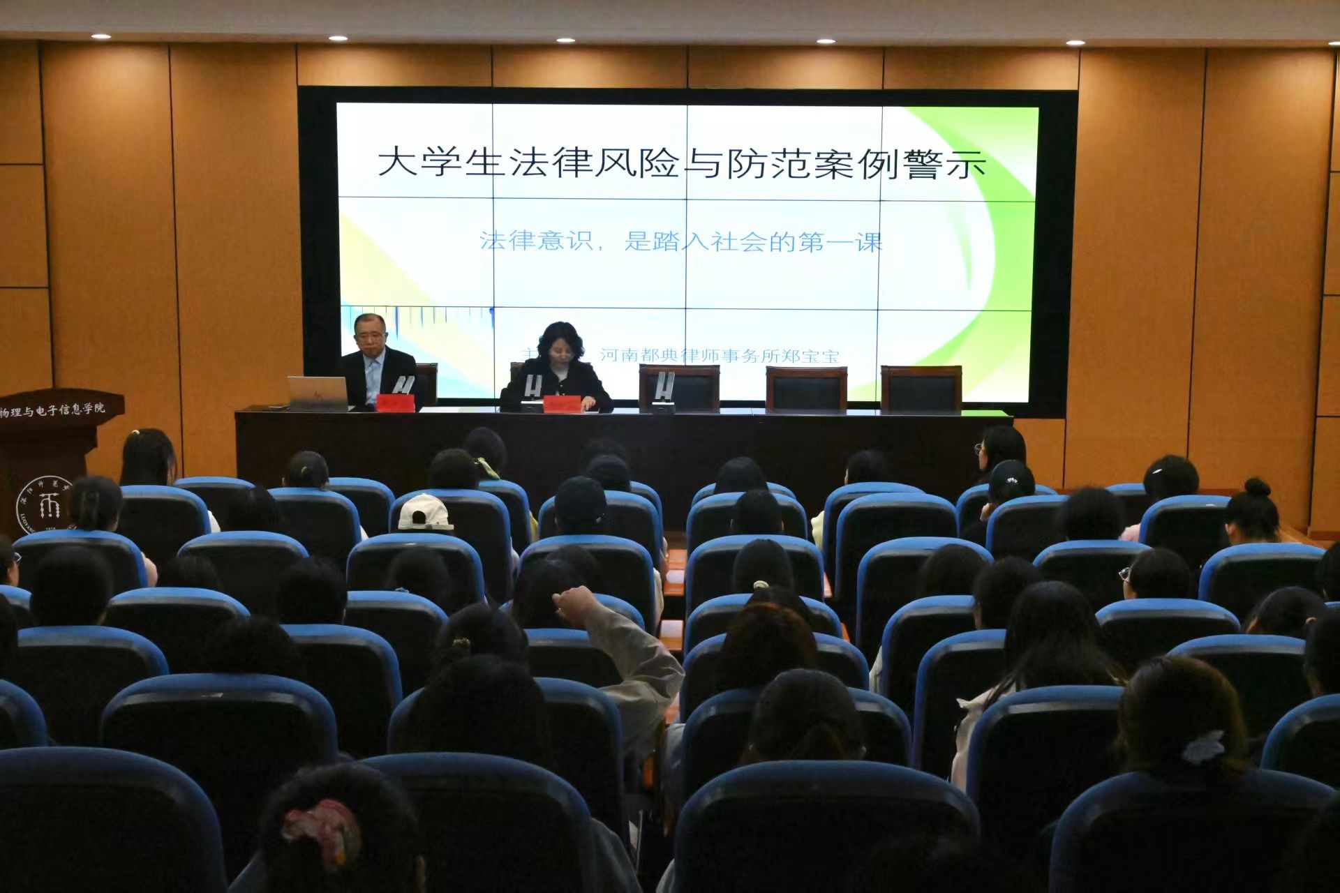 为防范校园法律风险,增强学生法律意识,10月16日下午,立雪书院学生社区在物理楼102报告厅举办大学生法律风险与防范案例警示宣传讲座。河南都典律师事务所律师郑宝宝主讲,立雪书院学生社区党委副书记高小静主持,书院70余名学生参与。