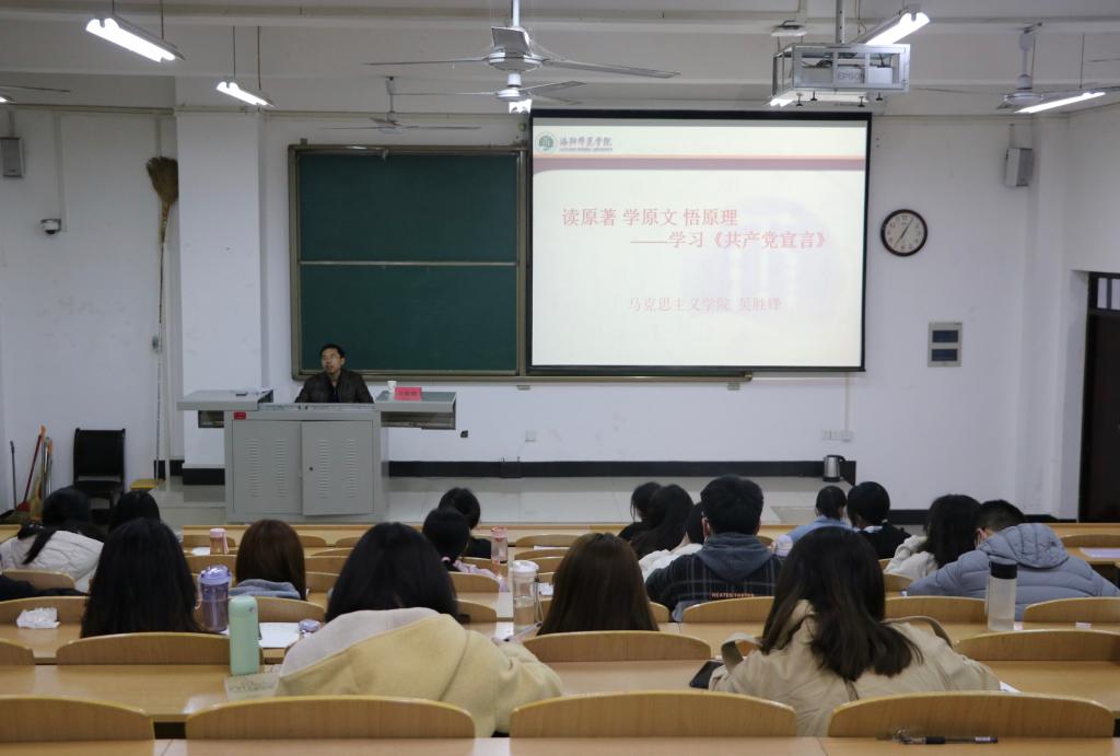 培训会上,吴胜锋以“读原著、学原文、悟原理”为主题,为同学们详细的介绍了世界巨著《共产党宣言》。他从“资产者和无产者”、“无产者和共产党人”、“社会主义的和共产主义的文献”、“共产党对各种反对党派的态度”四个部分对《共产党宣言》的内容进行了深入解读。他提出“为什么在近代中国无法确立资本主义制度?”让在场的同学们进行思考,并根据马克思提出的“处于市民社会”与“进行了工业革命,经济科技迅速发展”这两条建立资本主义制度的条件对这一问题进行了解答。他强调,《共产党宣言》是共产党员初心和使命的精神之源,它始终坚持人民至上政治立场,积极推动构建人类命运共同体。培训最后,他号召同学们认真读《共产党宣言》一类的著作,了解共产党人的思想与方法,体会经典著作的现代价值。
